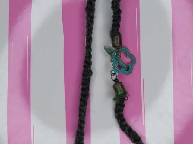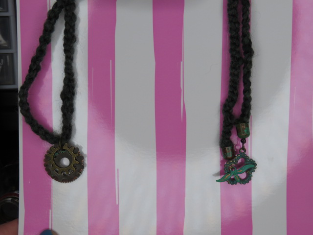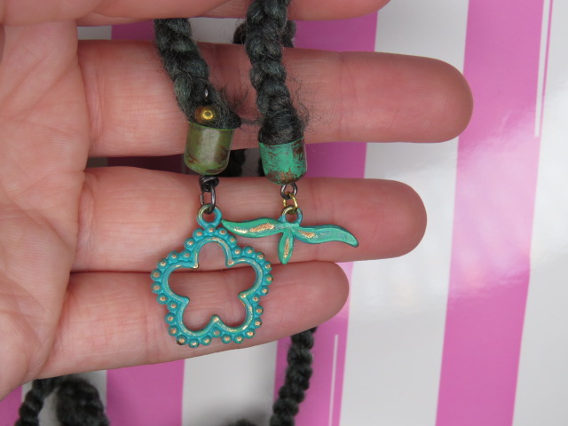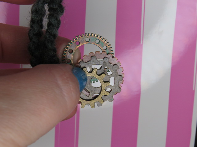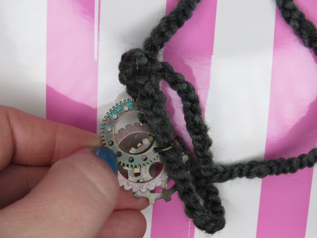 Featuring braided cruelty free gray yarn, handmade faux patina'd flower and leaf clasp, four piece steampunk gears centerpiece pendant