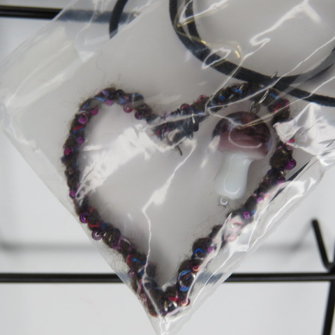 purple yarn heart and mushroom charm necklace