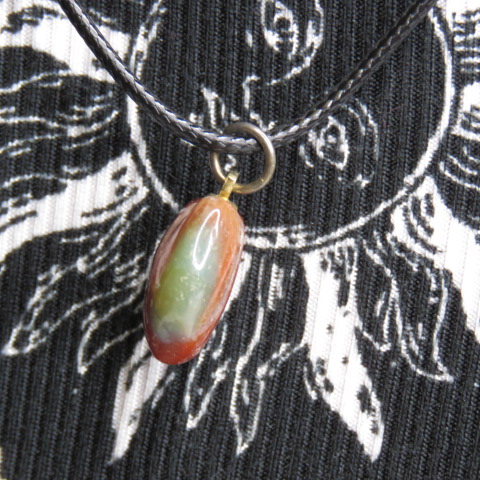 red, green jasper with quartz streak, polished in mexico. restrung, with simple minimalist necklace. south African stone.