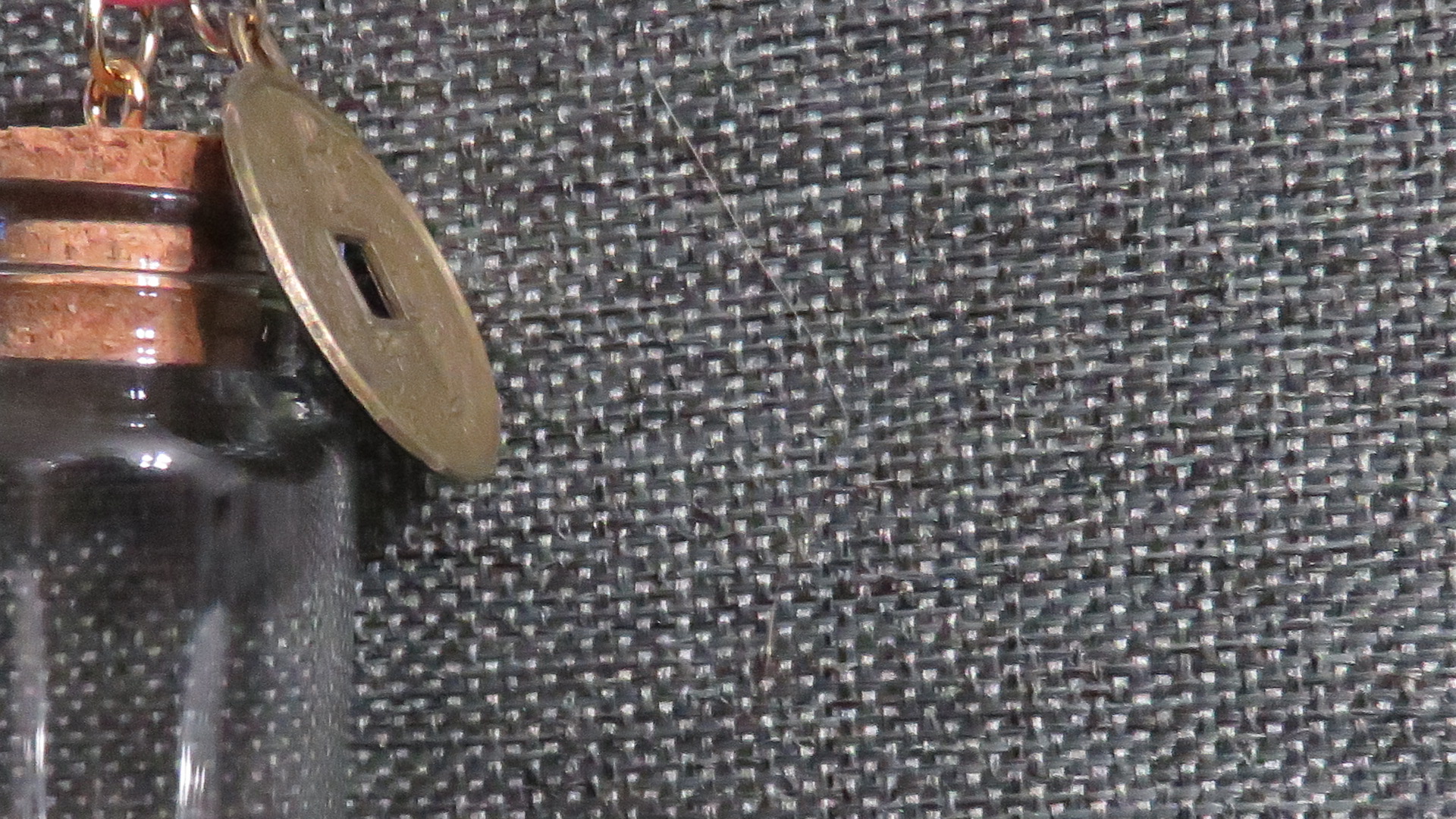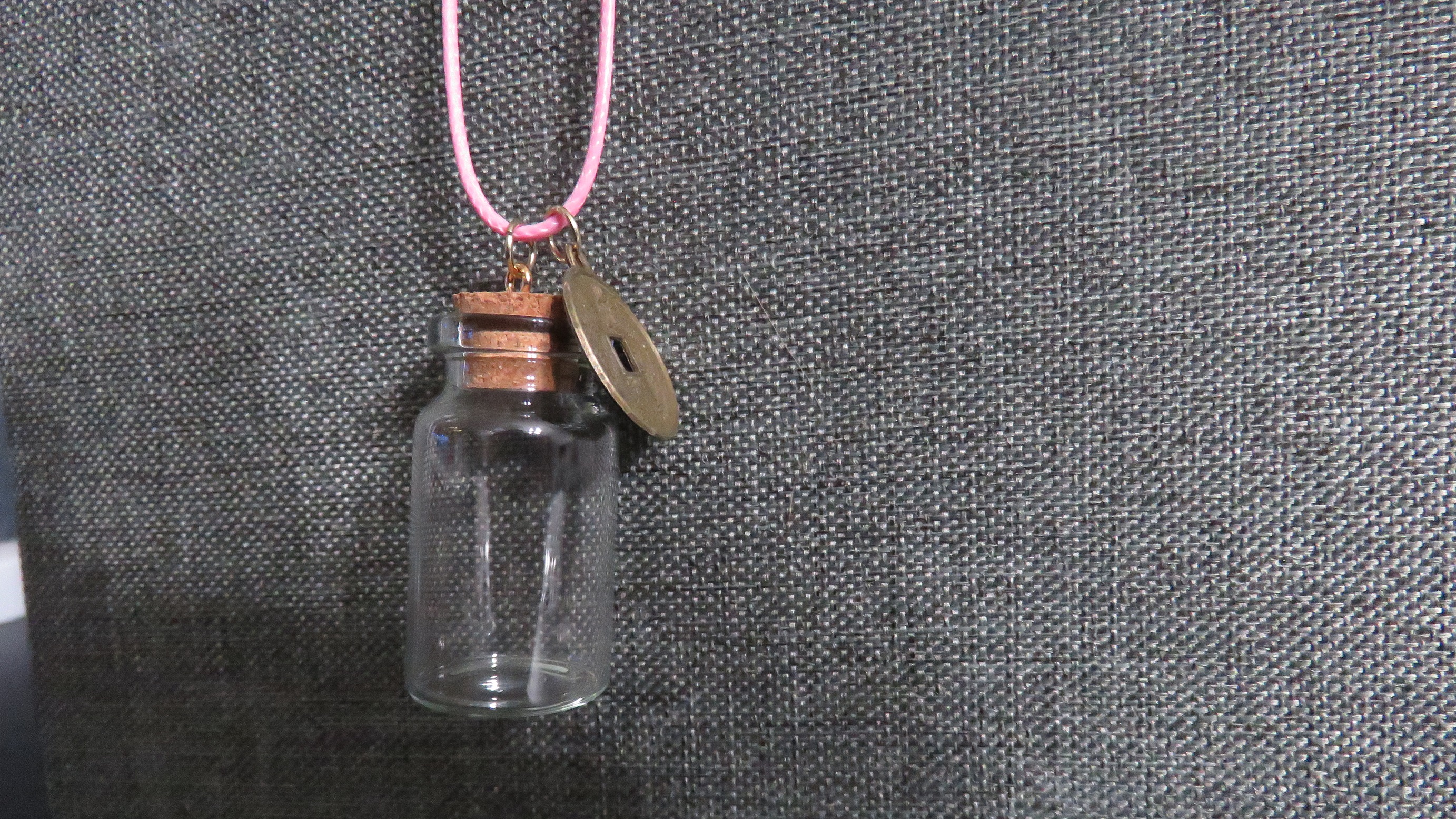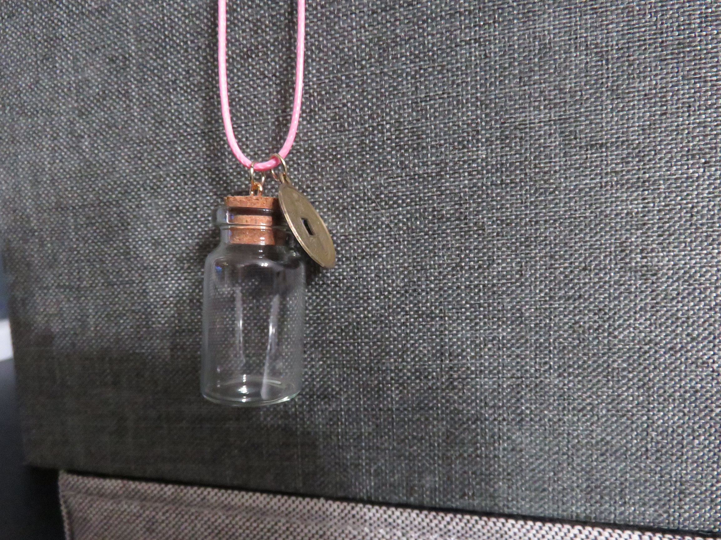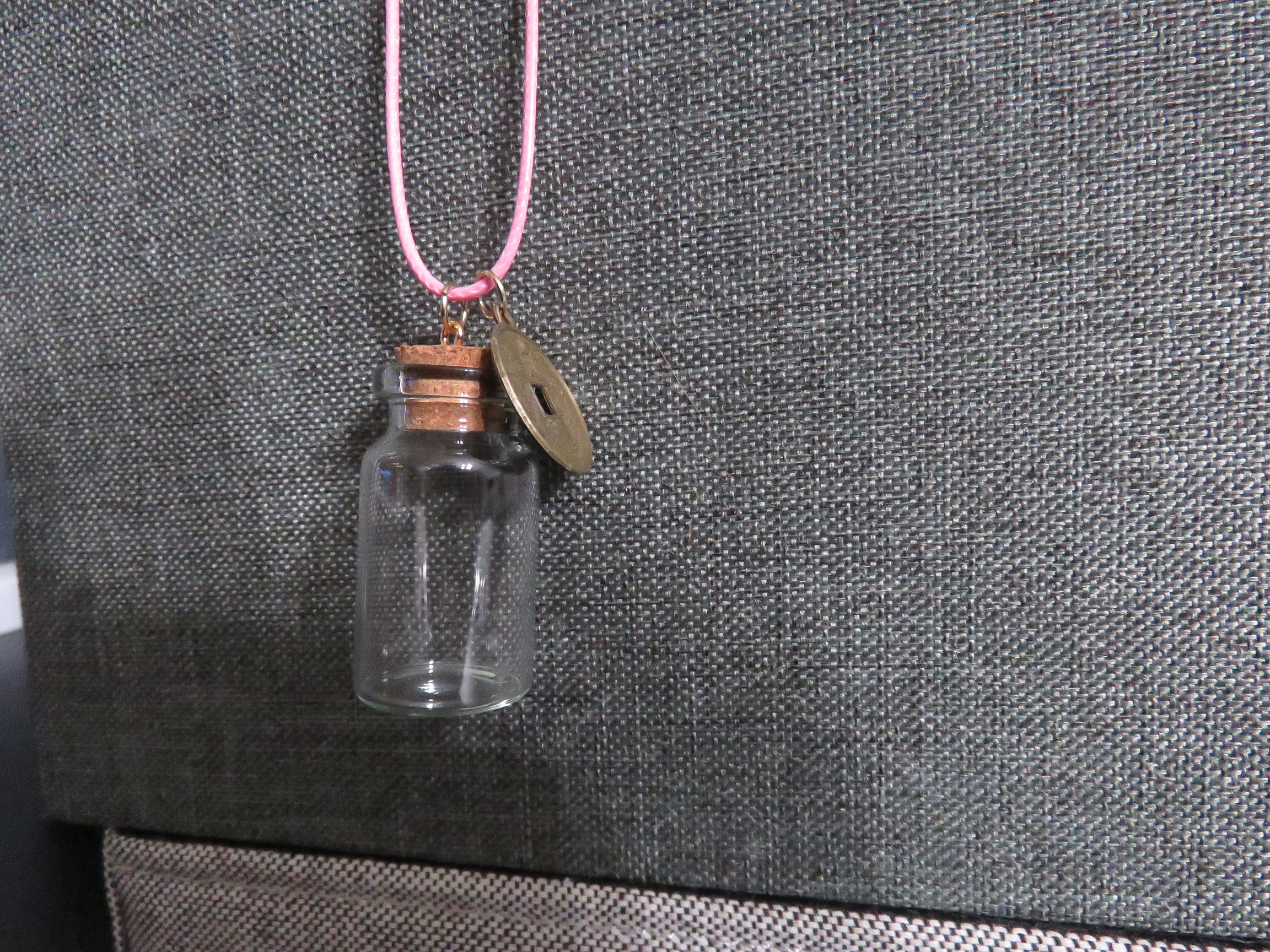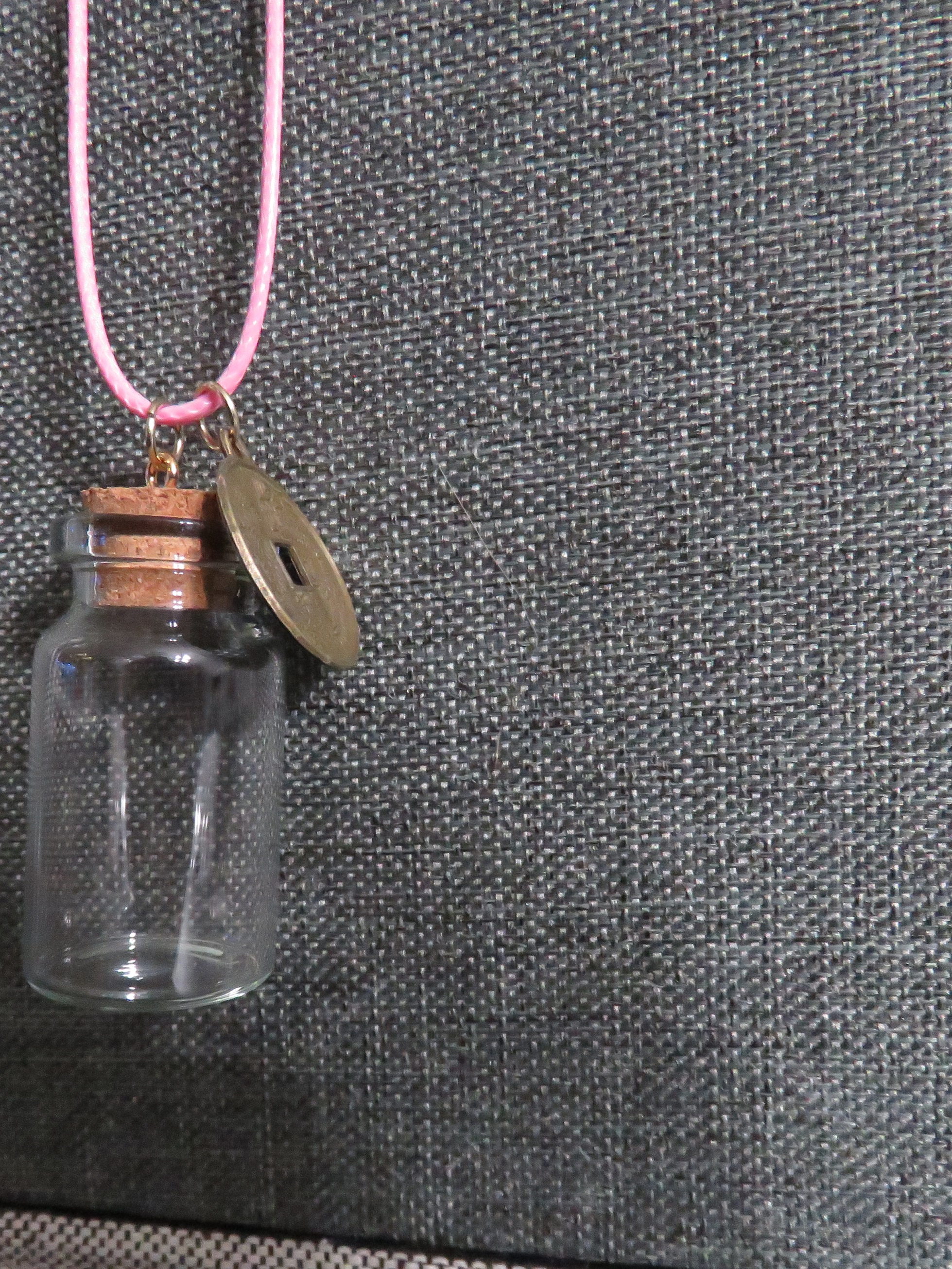 Small Corked Bottle Coin Charm Necklace silver clasp pink string