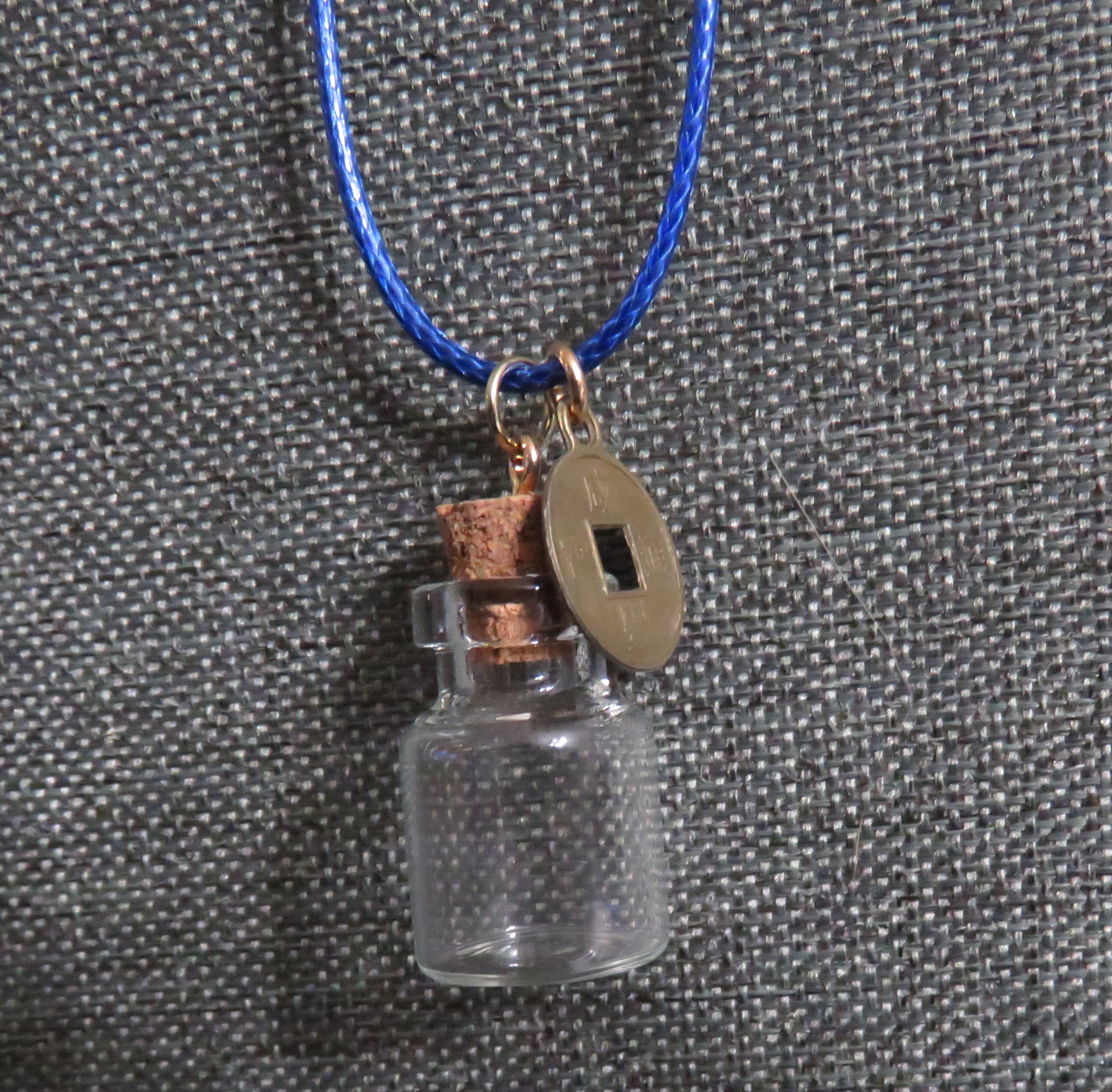 Extra Small Corked Bottle Gold Coin Charm Necklace silver clasp blue string