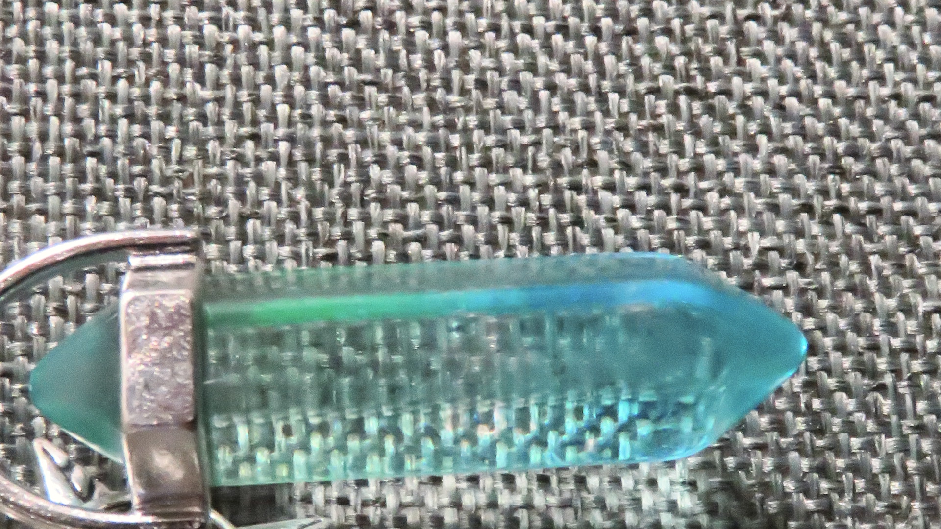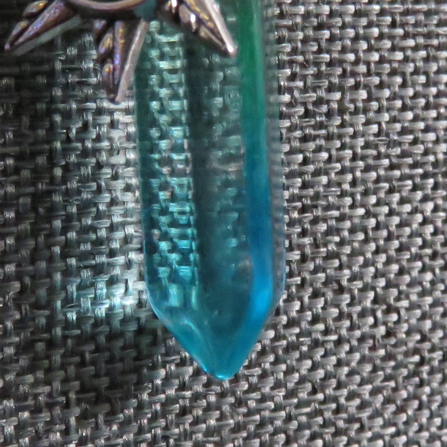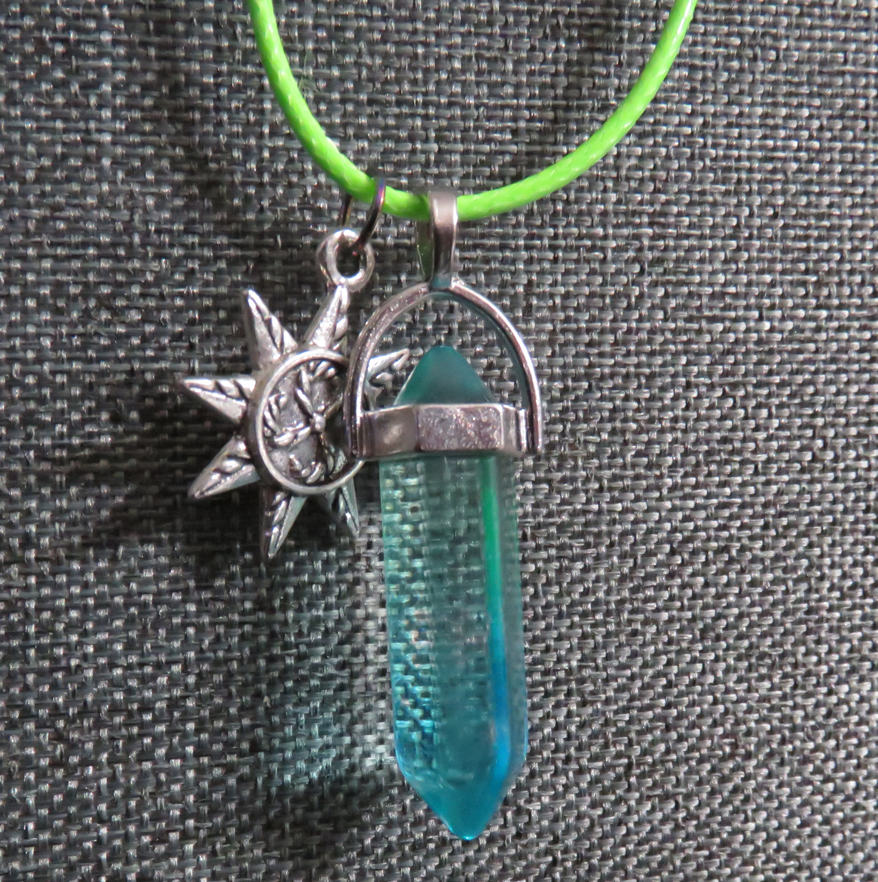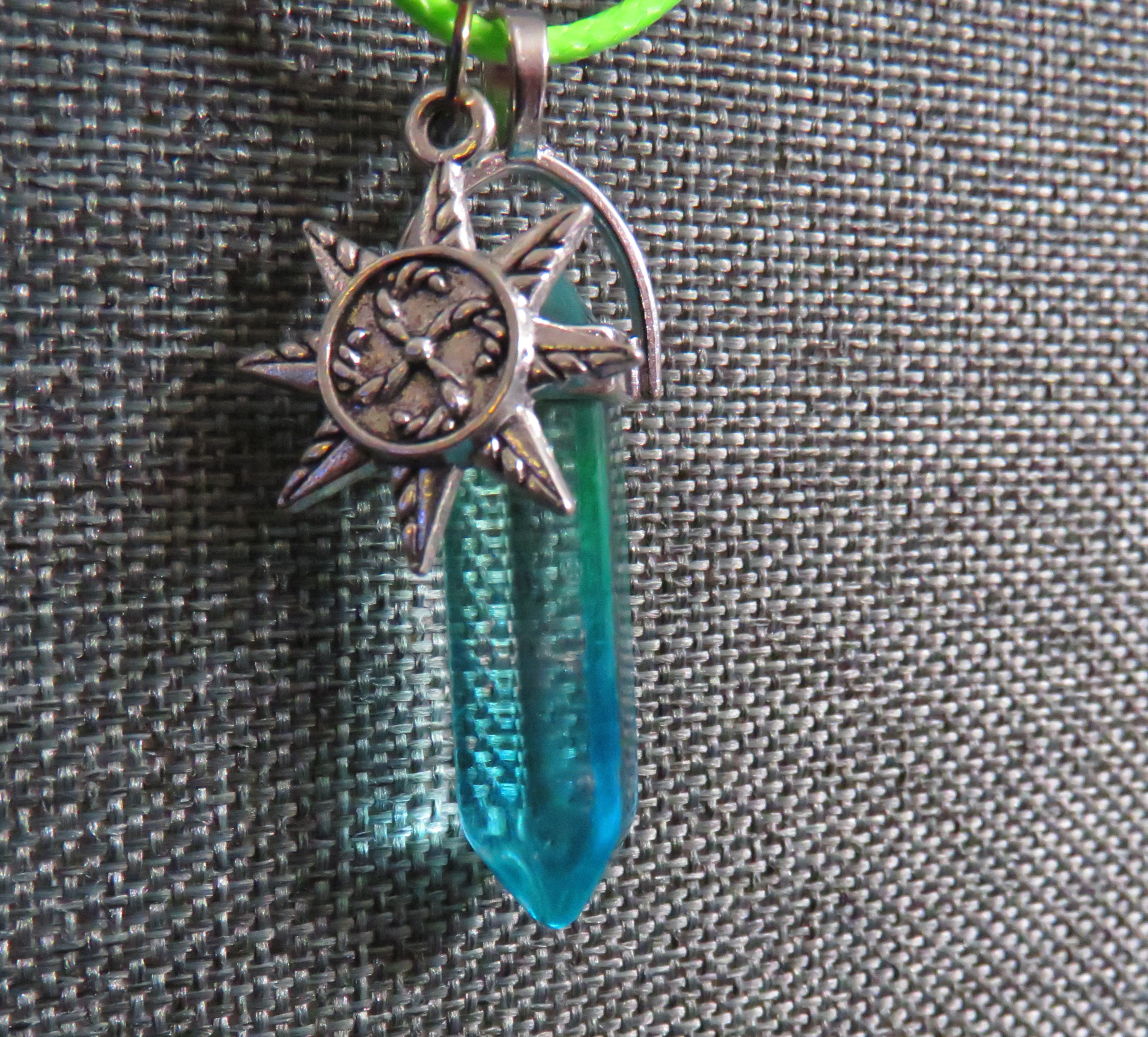 Ombre Blue to Teal Glass Crystal Pendant, 8-Point Star Charm, Neon Green Cord, Silver Themed