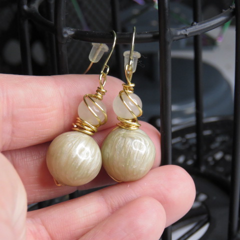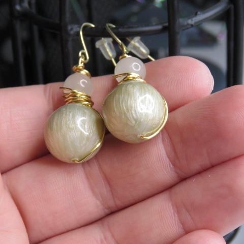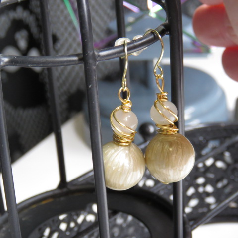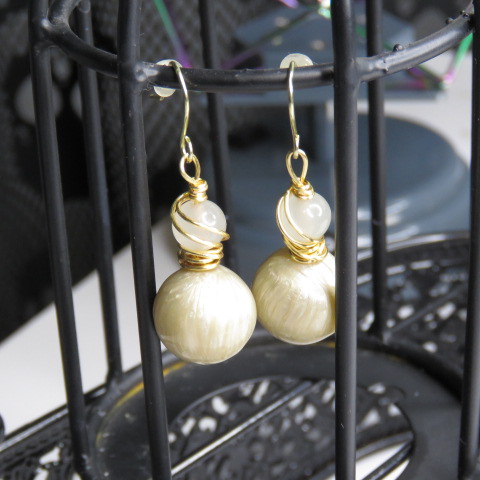[SALE]Cream Acrylic Bead Gold Wire Wrapped Earrings