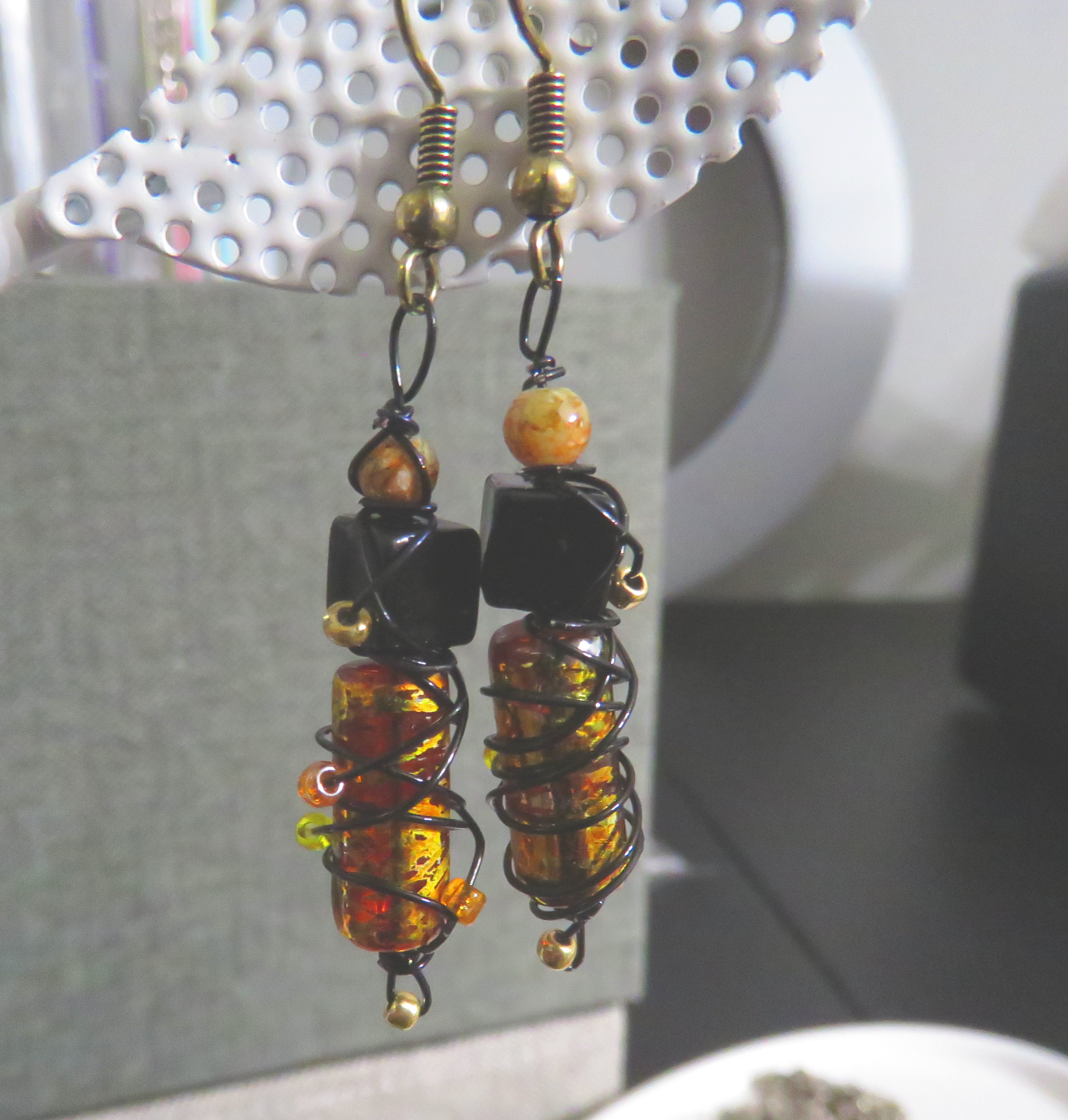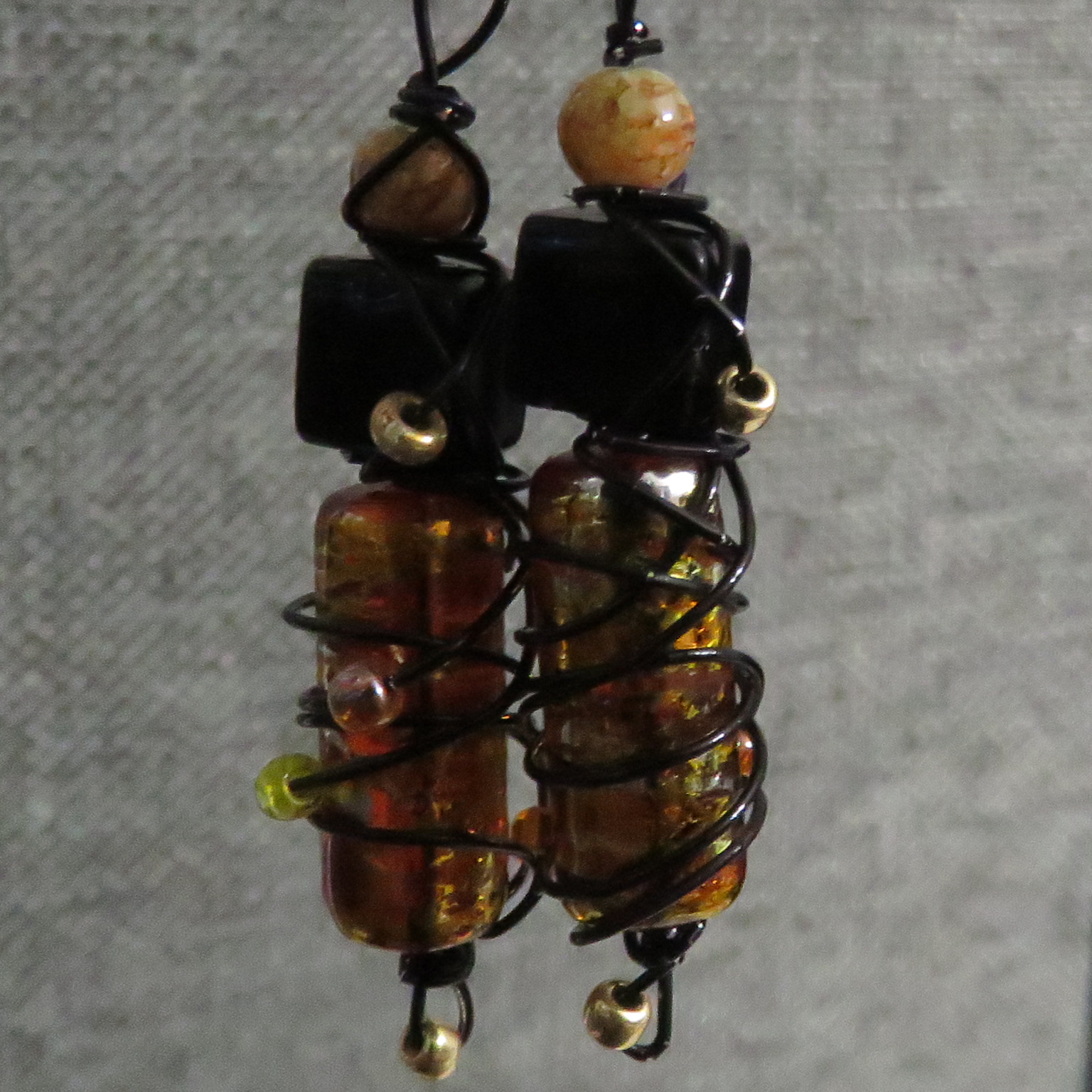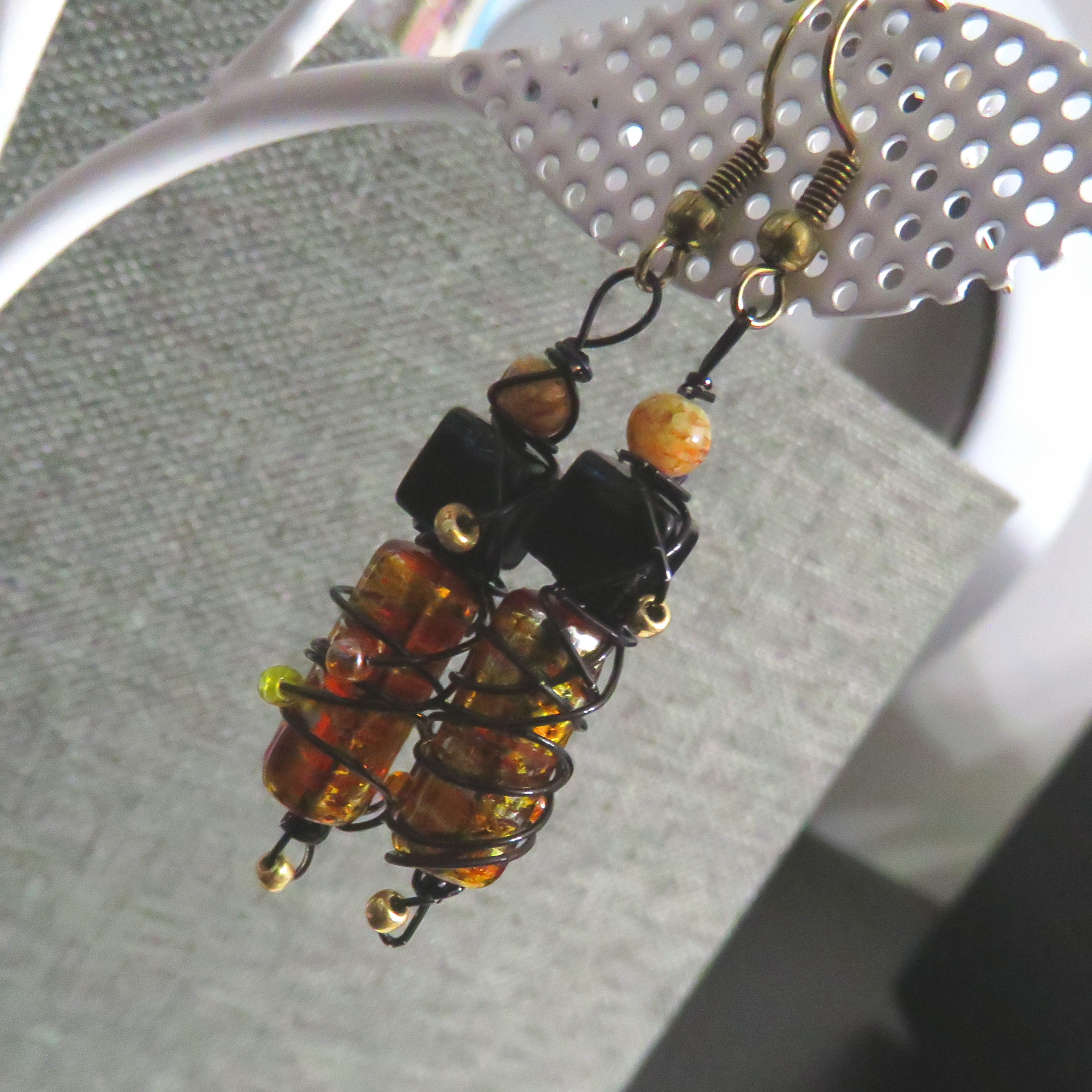 Black Swirled Wire Wrapped Orange Gold Glass Enameled Earrings