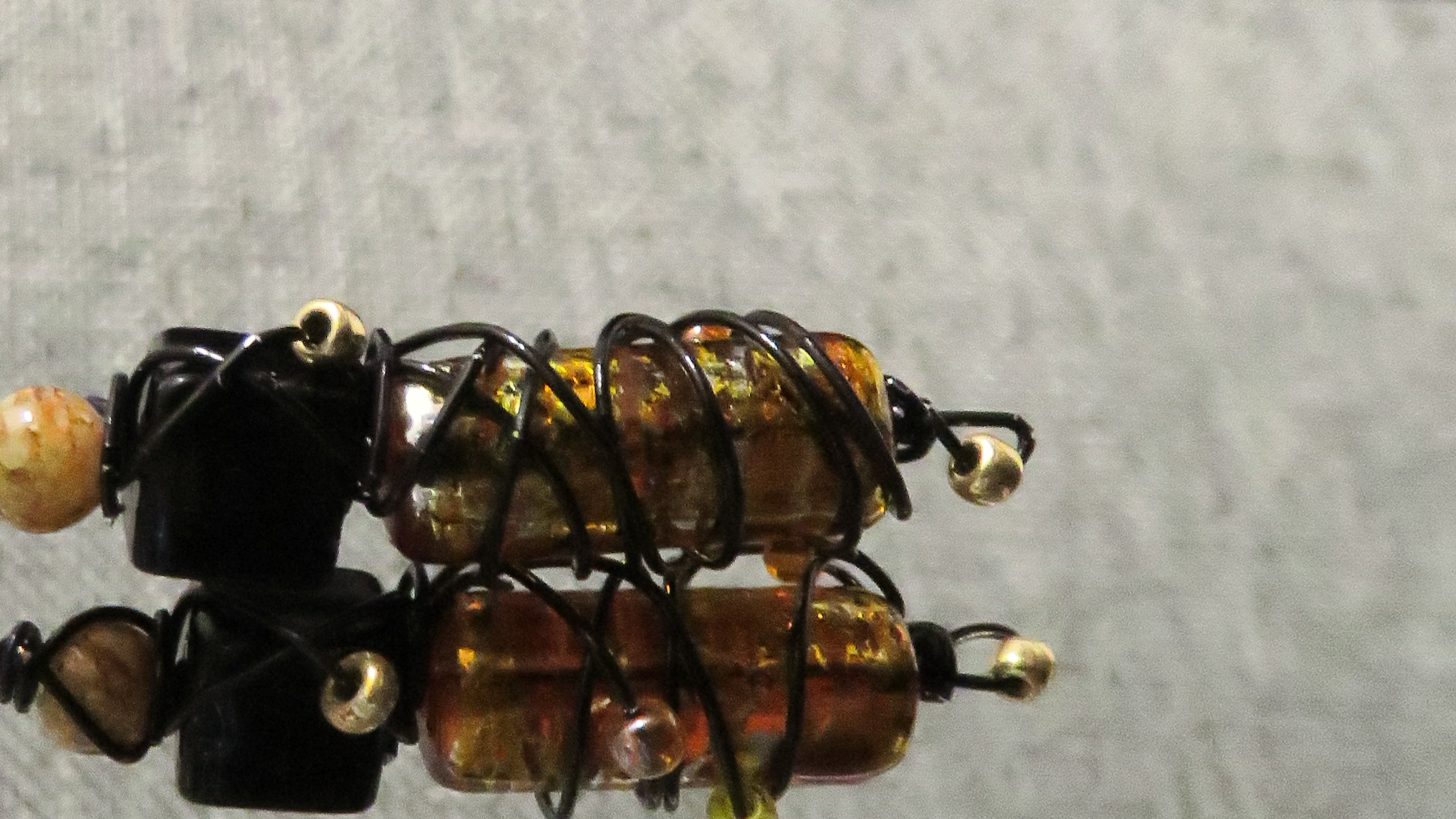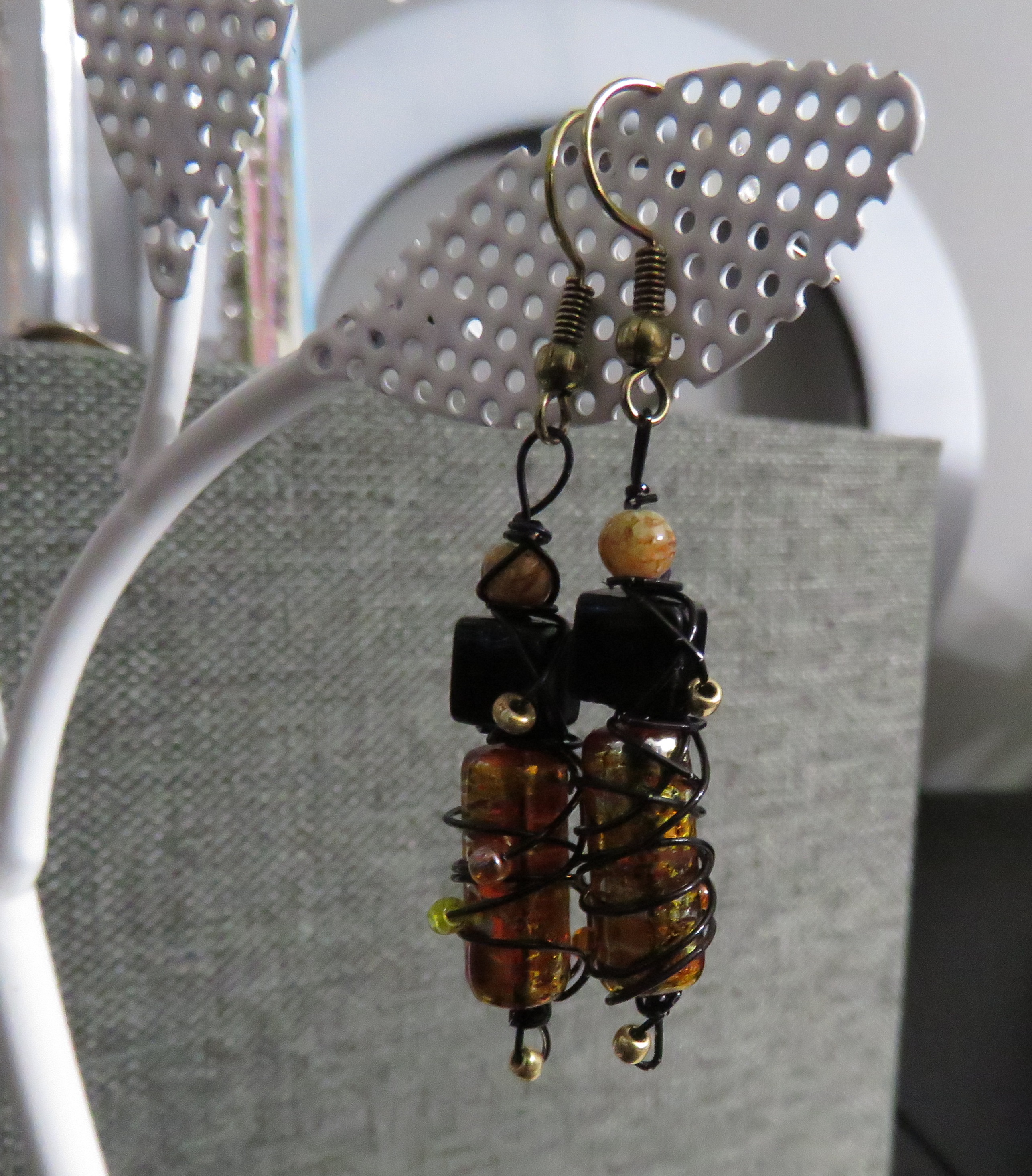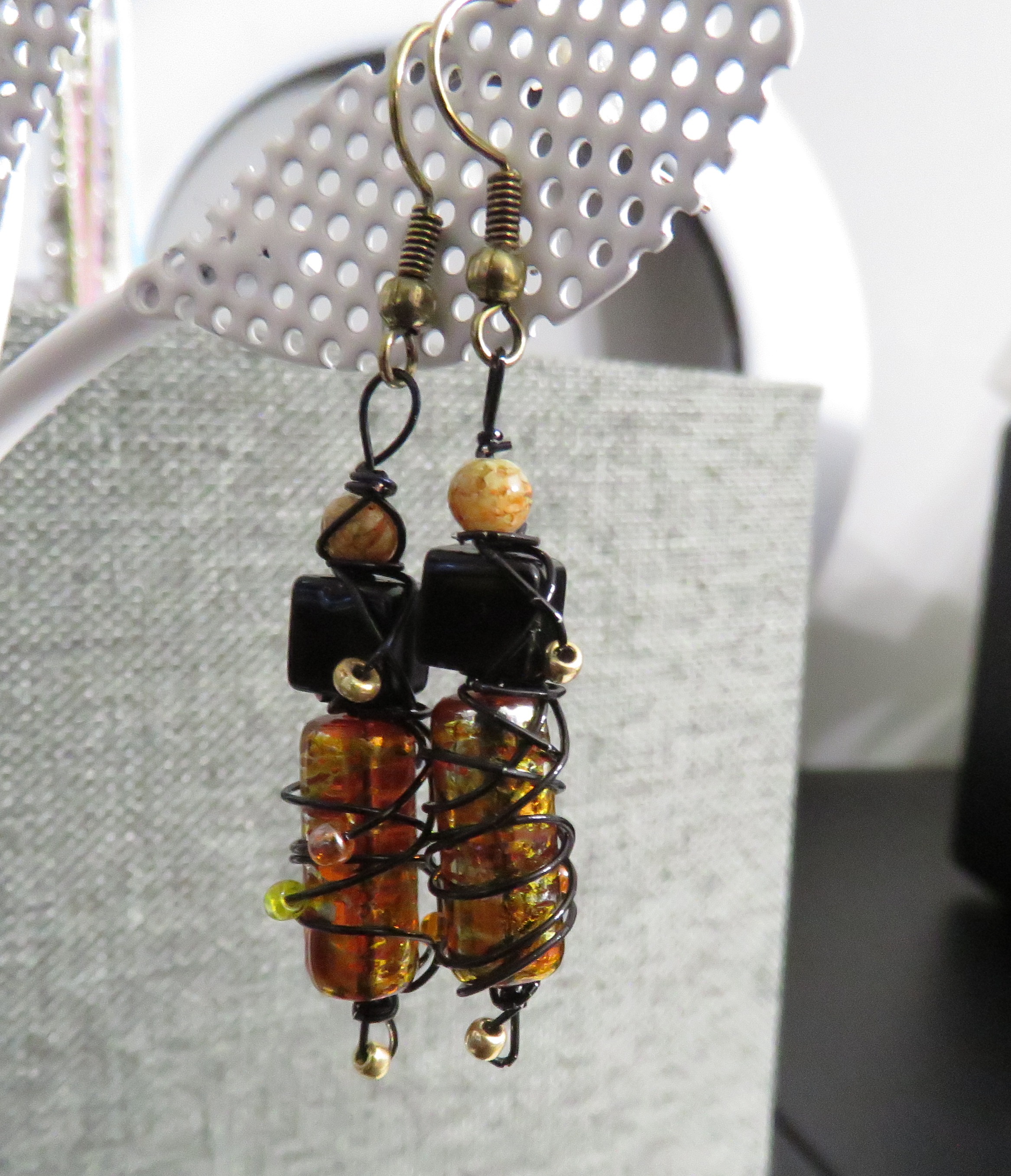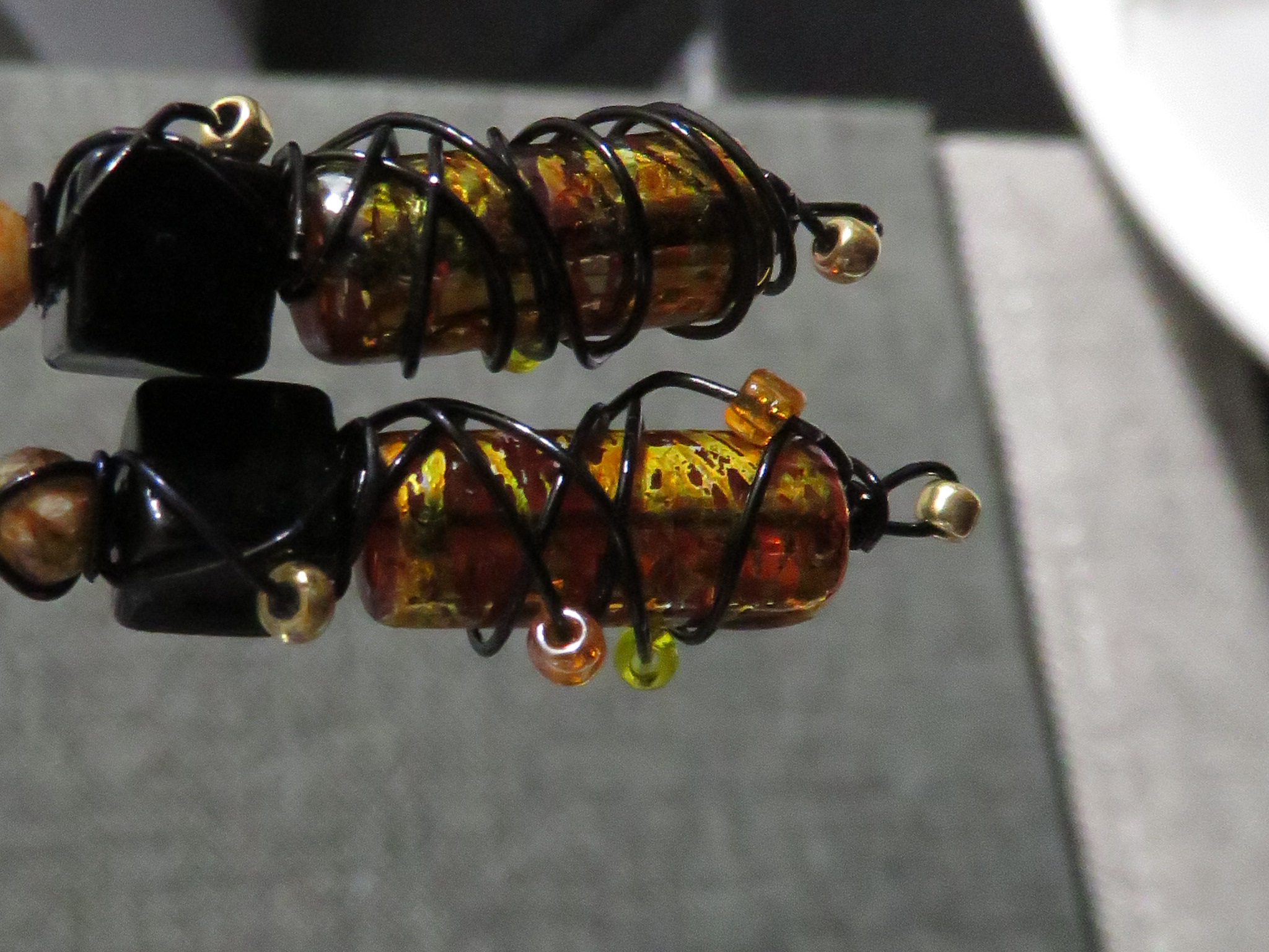 Black Swirled Wire Wrapped Orange Gold Glass Enameled Earrings