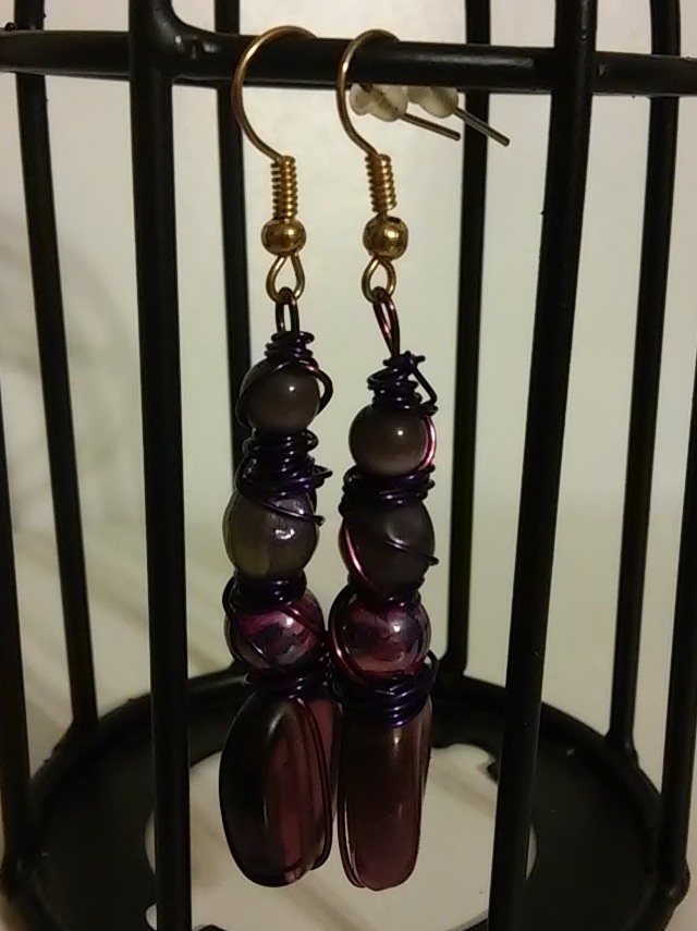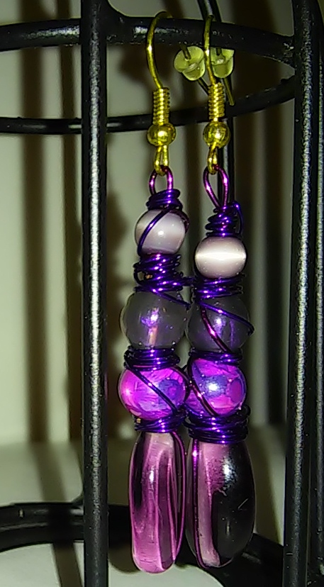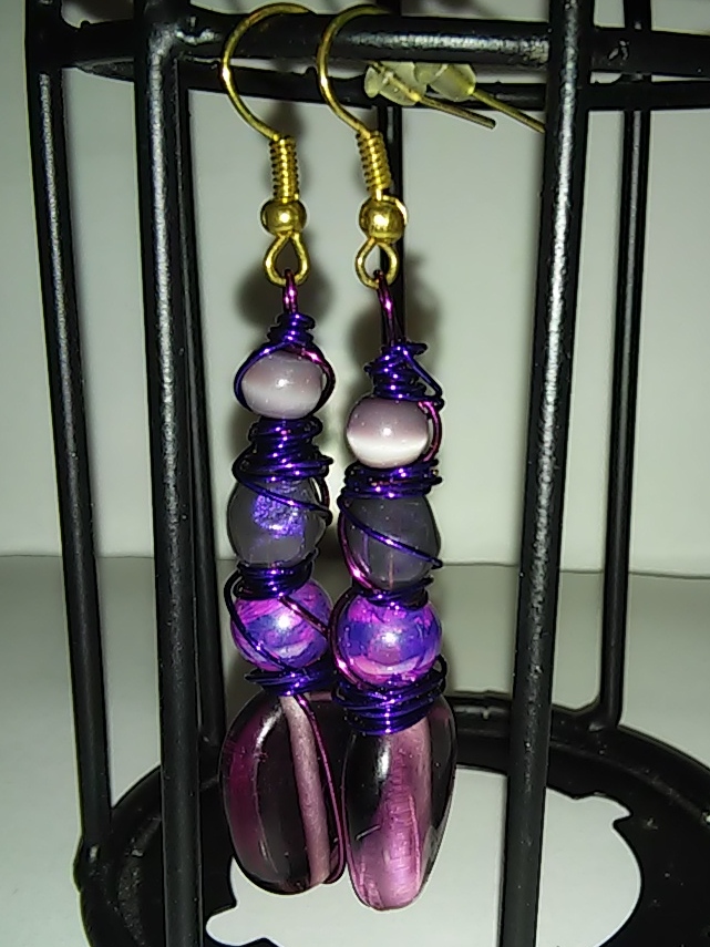 Quad Beaded Purple Glass Splatterpainted Twisted Metal Wire Art Earrings with Gold Hooks