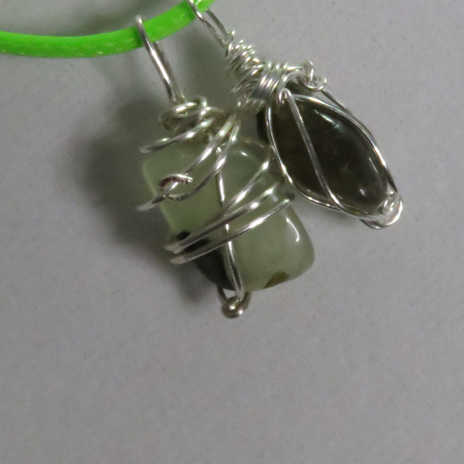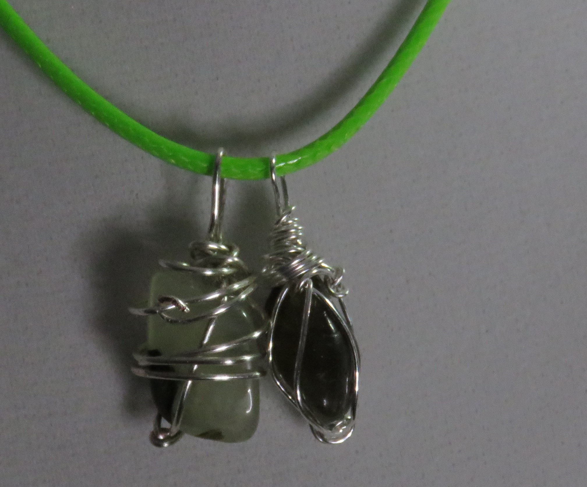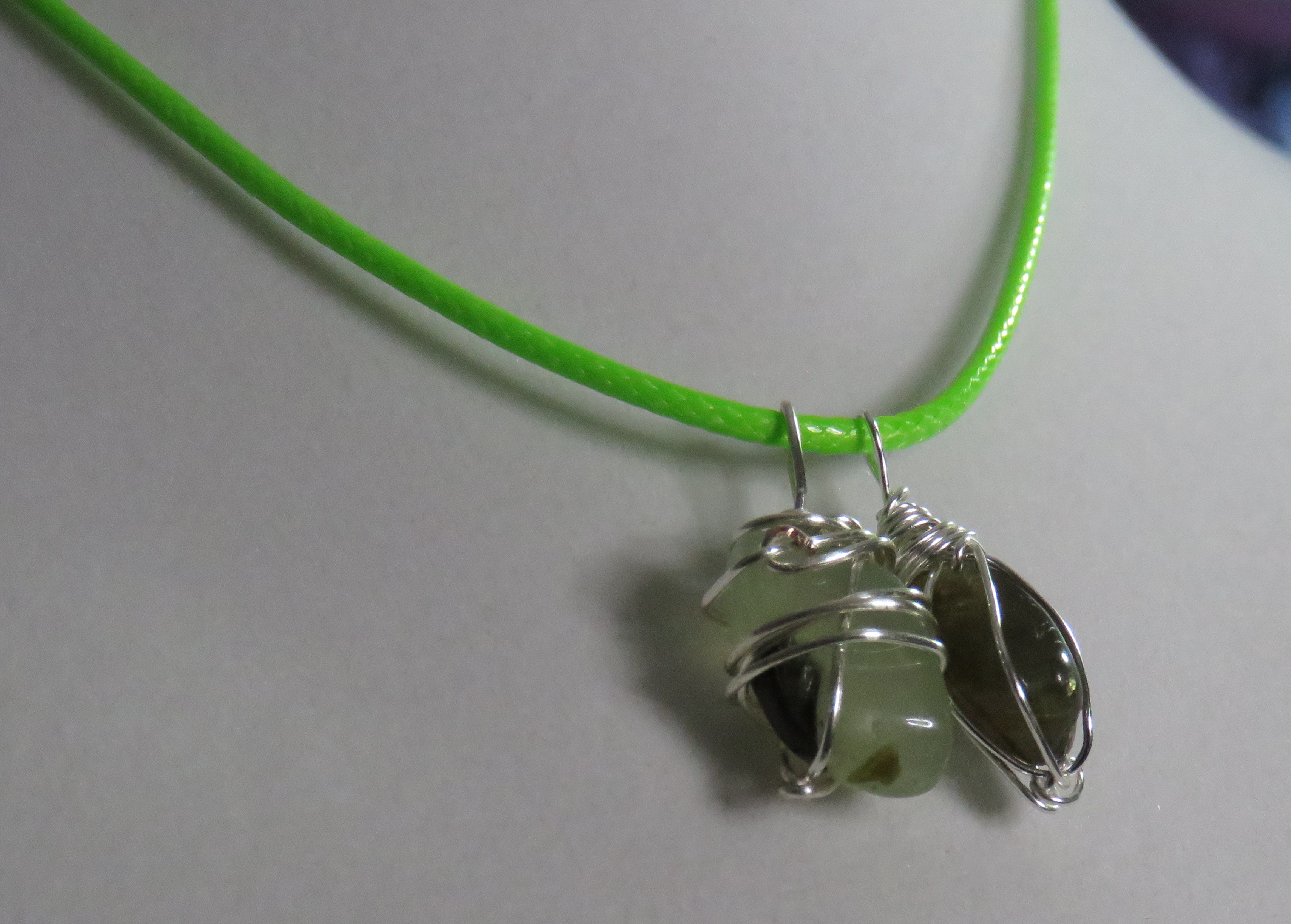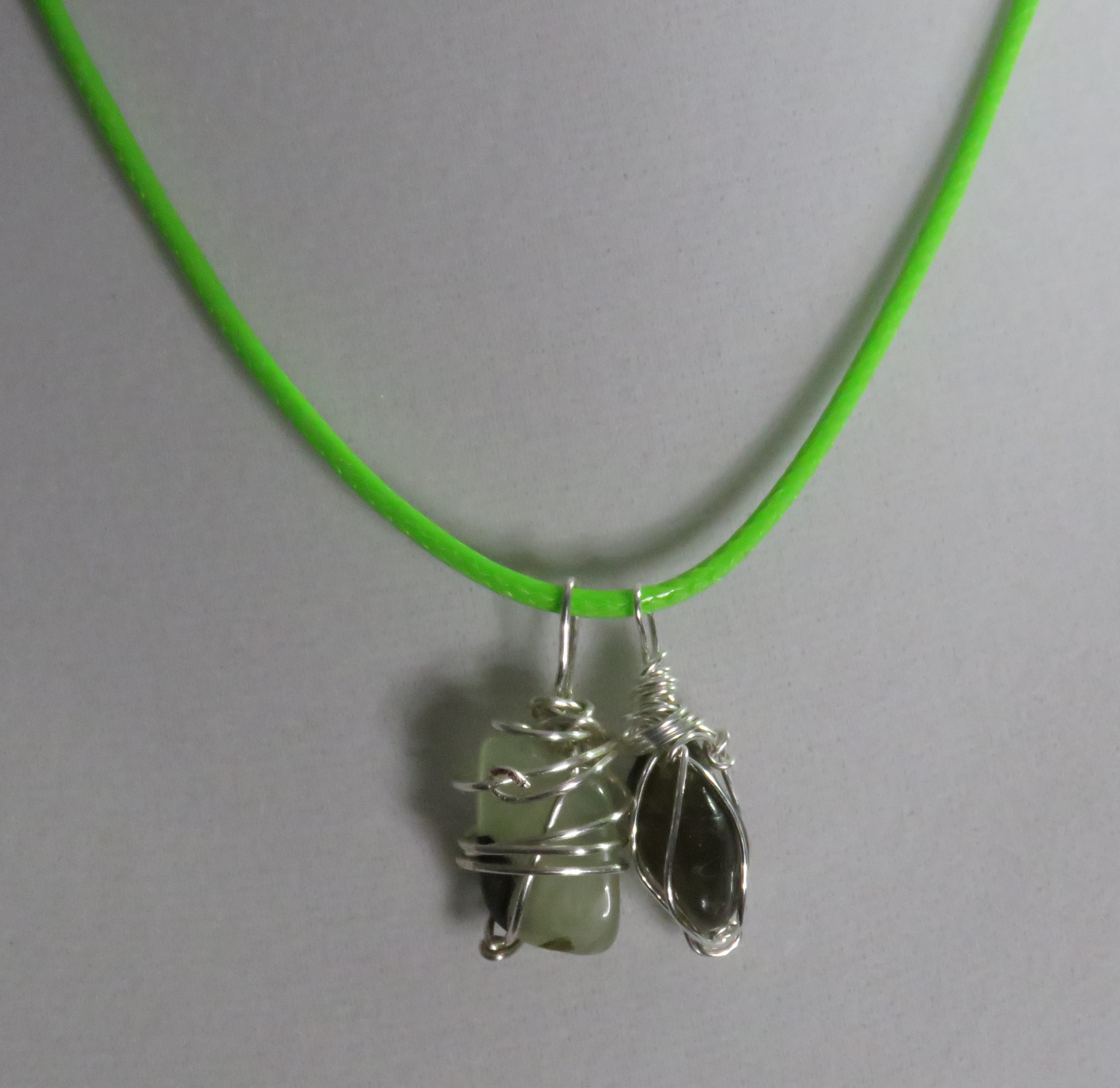 green cord with silver clasp and silver wire