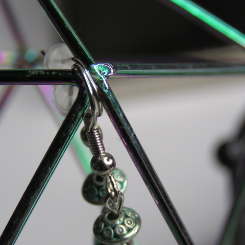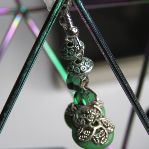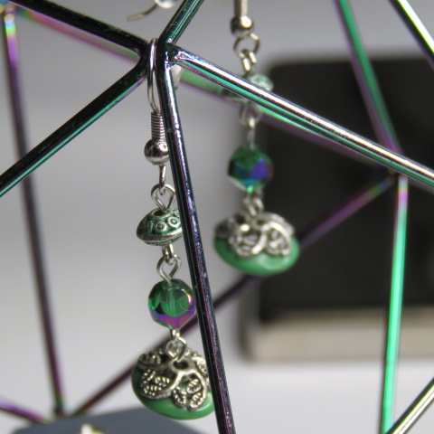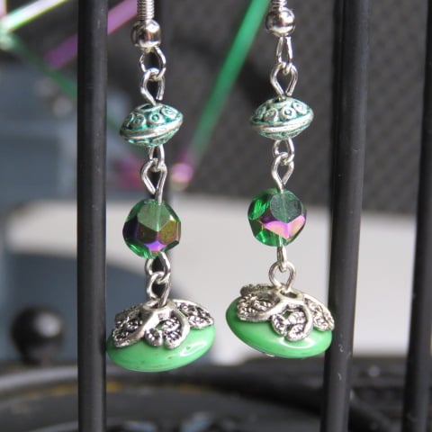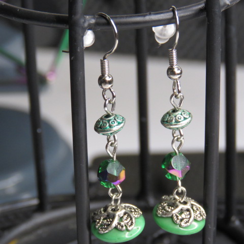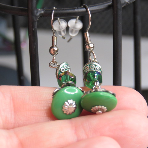 [SALE]Green Disc Glass Bead Silver Tiered Drop Earrings
