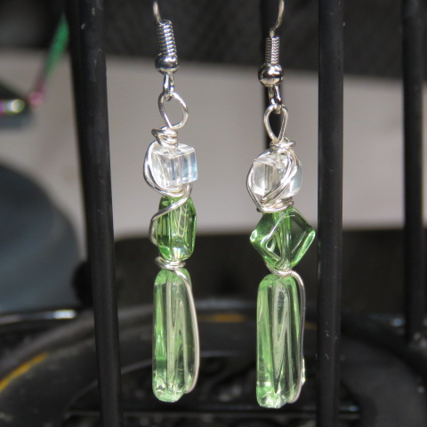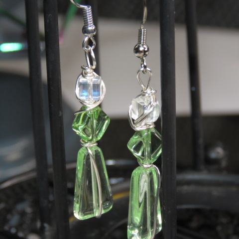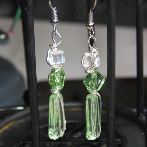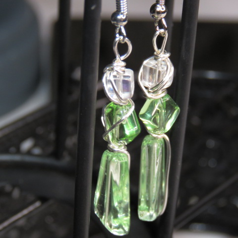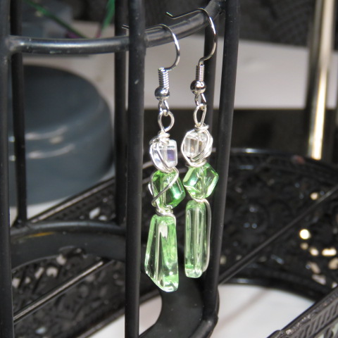 [SALE]Green and Clear Glass Silver Wire Wrapped Earrings