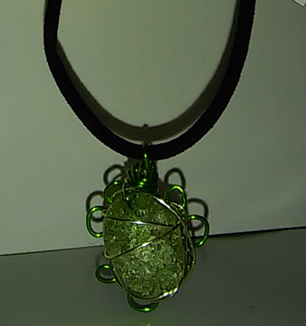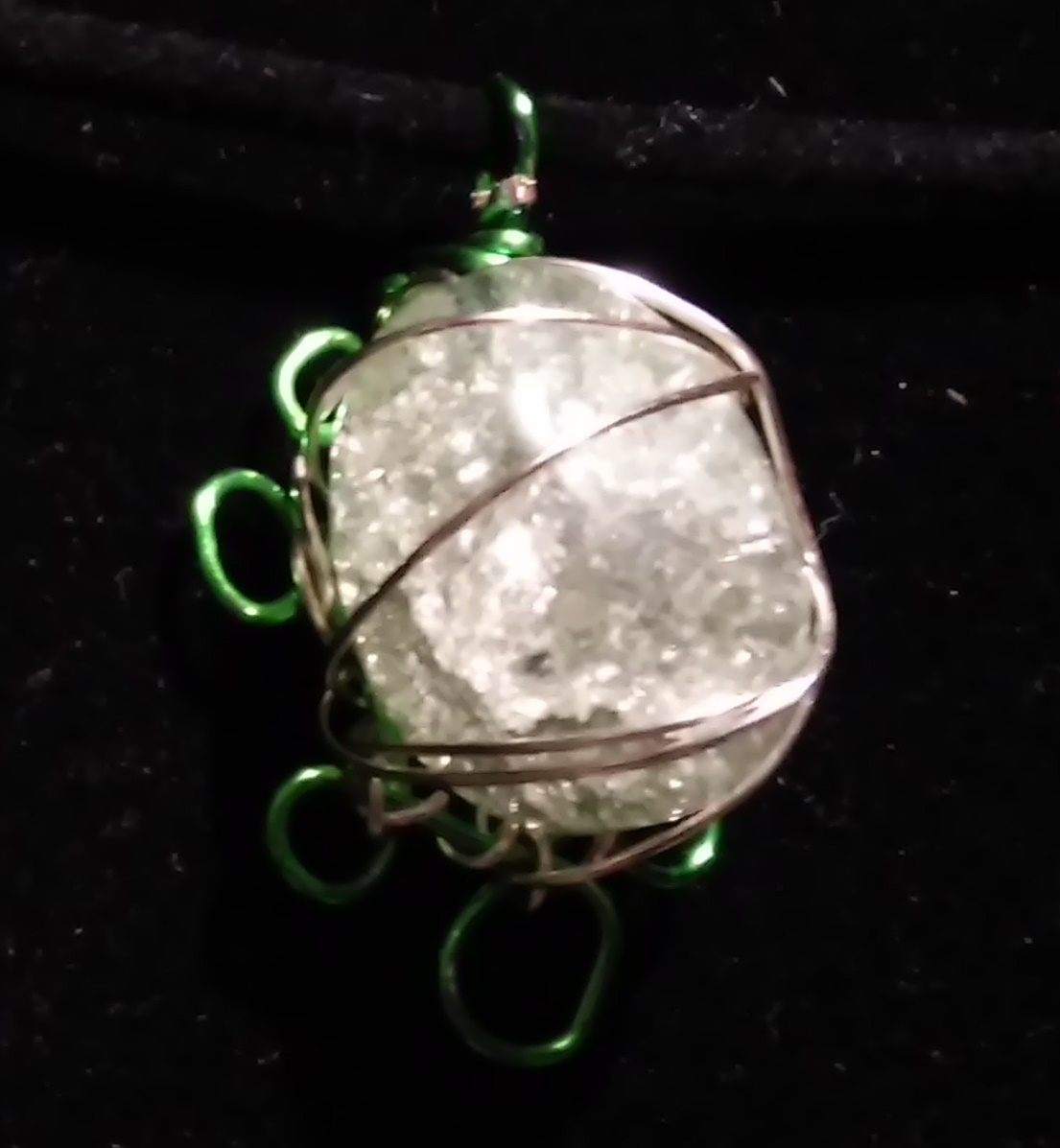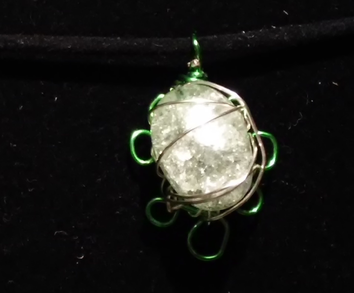 Silvery Green Crackle Stone and Green and Silver Color Copper Wire Curls Woven Pendant Necklace