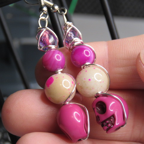 [SALE]Pink Skull and Cream Splatter Paint Silver Wire Wrapped Earrings