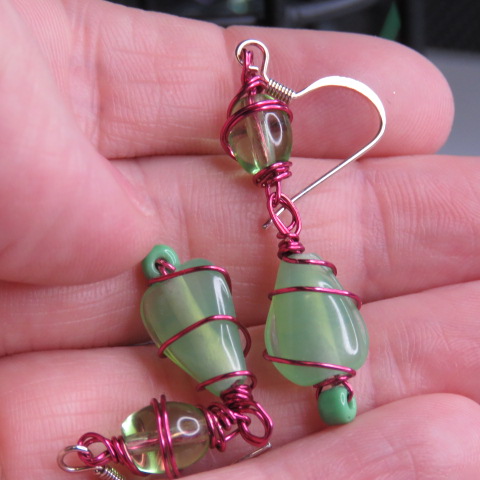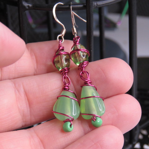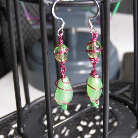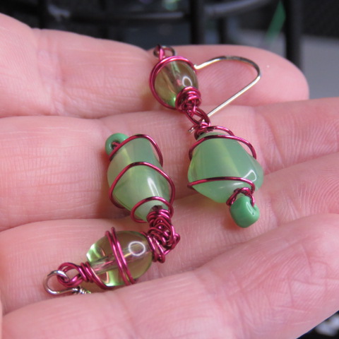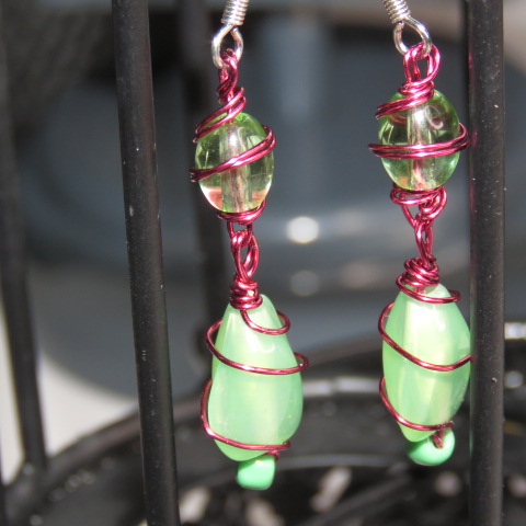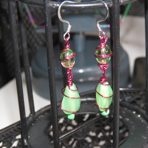 [SALE]Watermelon Pink Wire Wrapped Punk Green glass Earrings