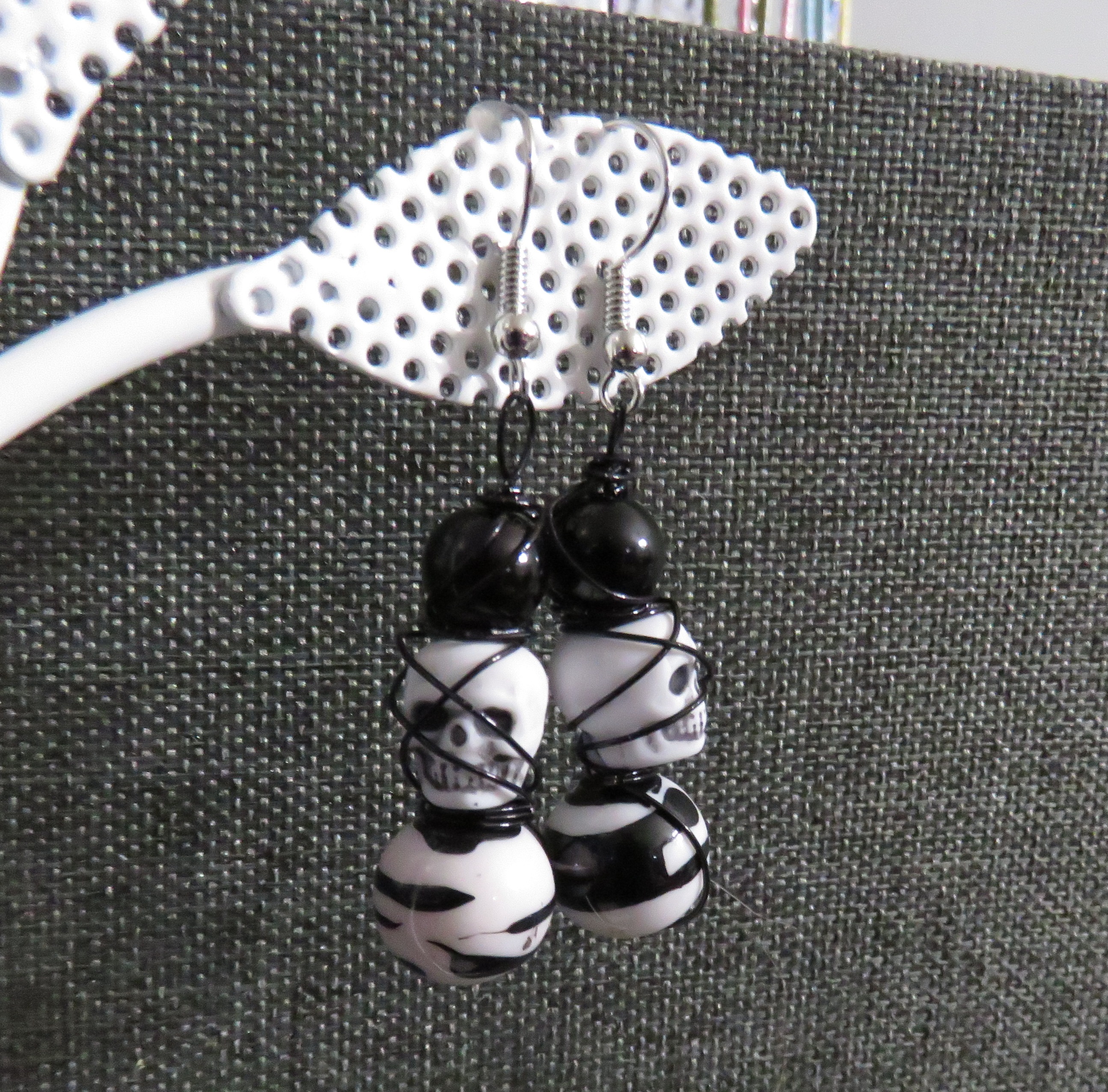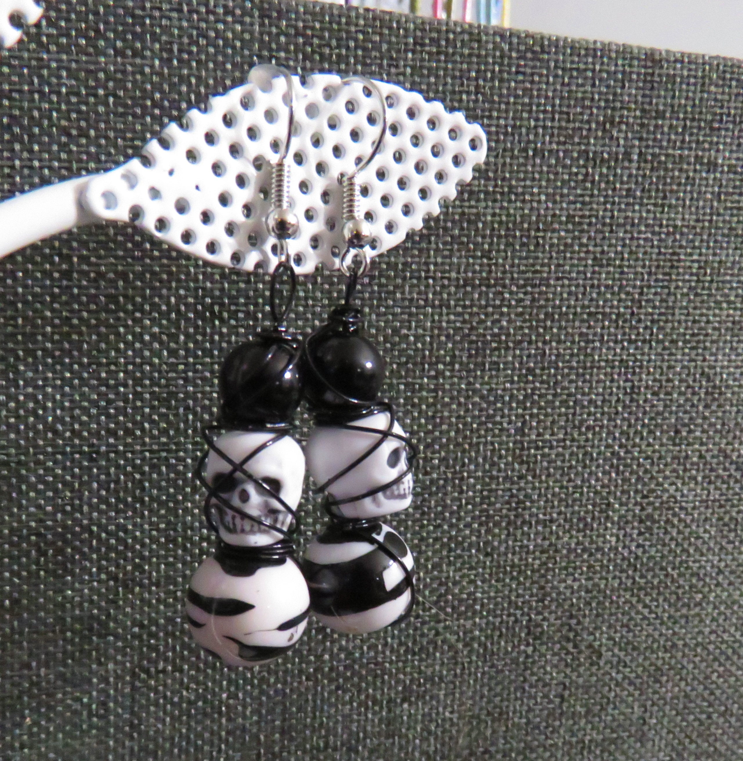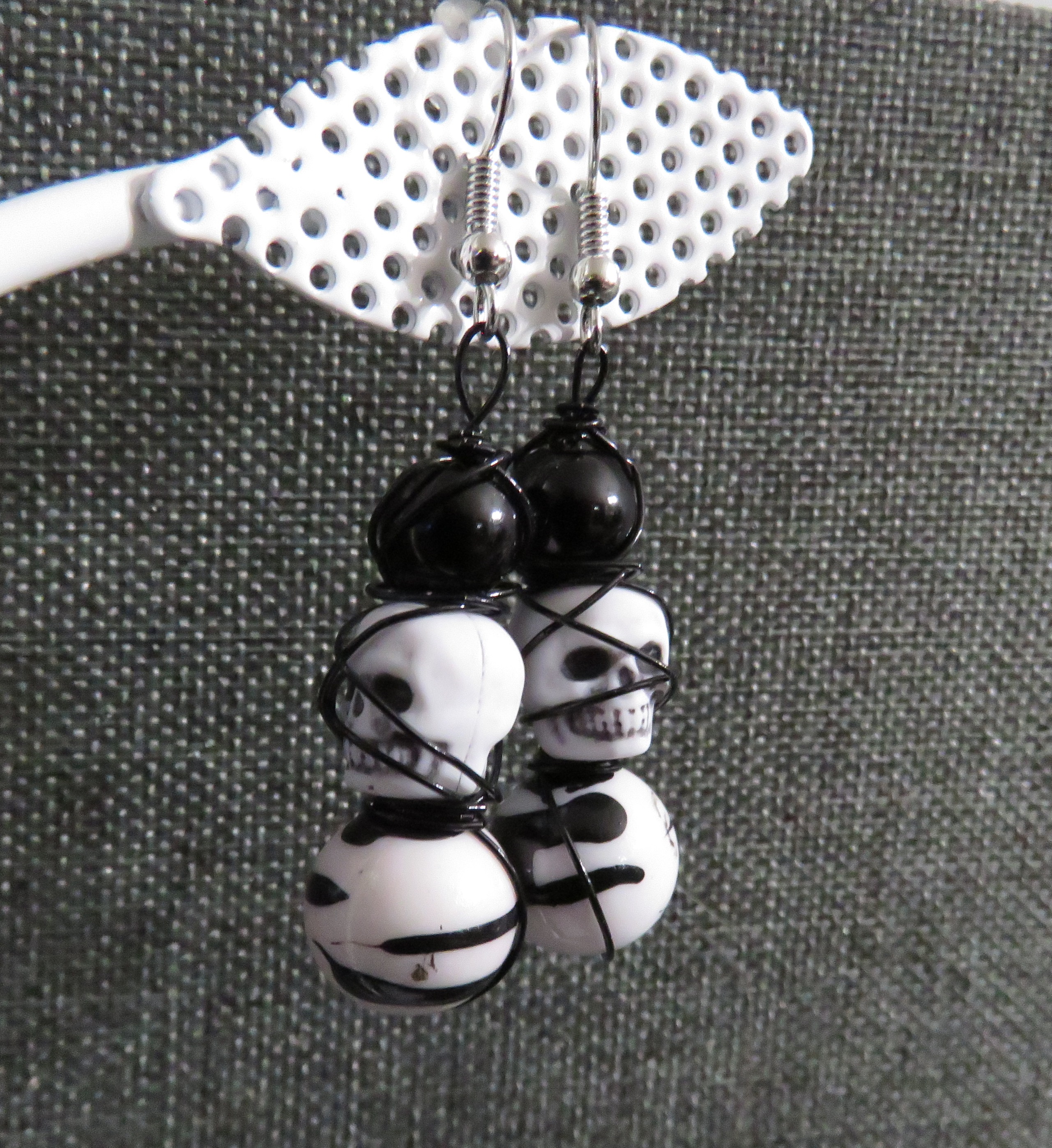 White and Black Swirled Skull Black Wire Wrapped Earrings