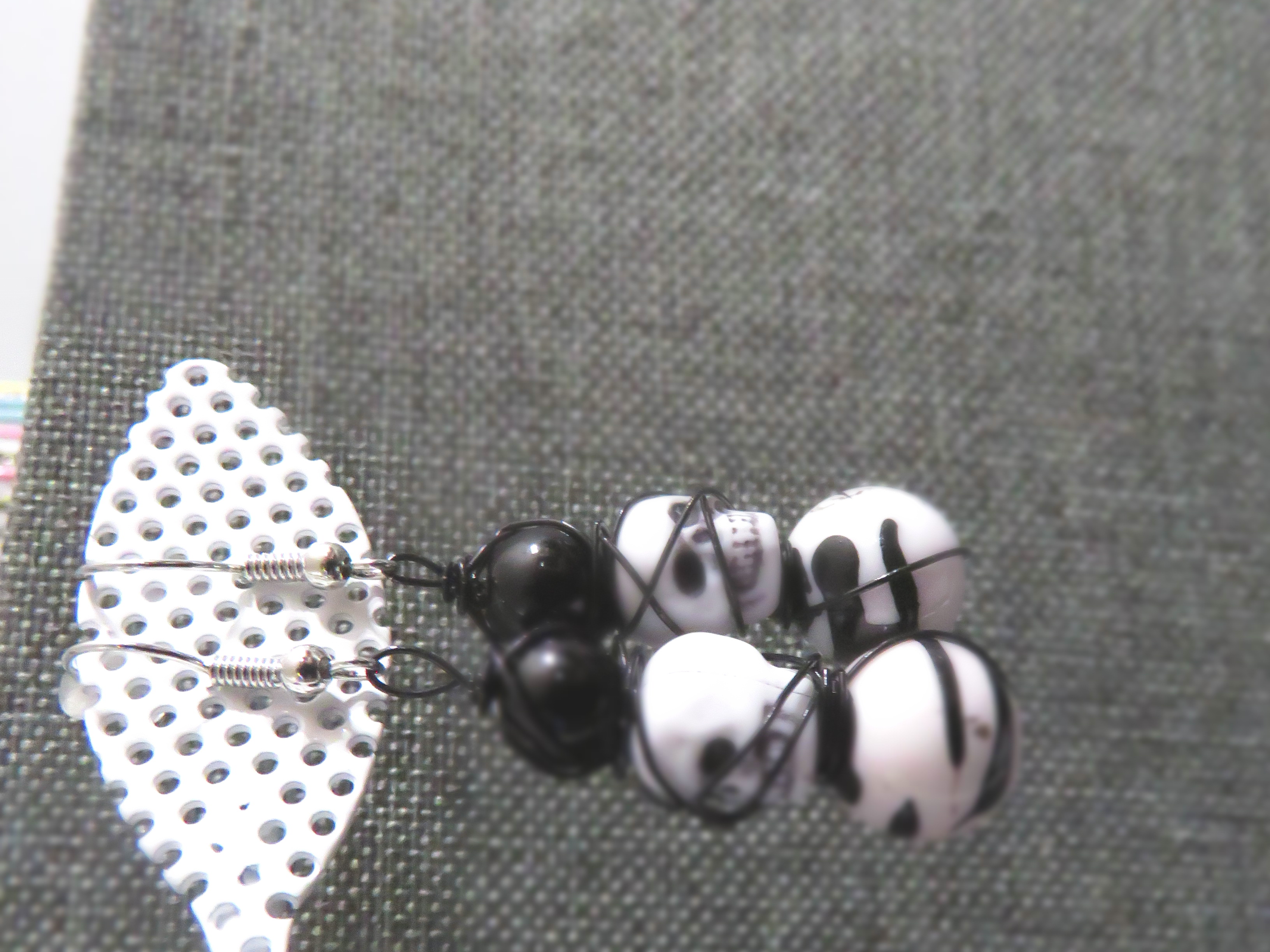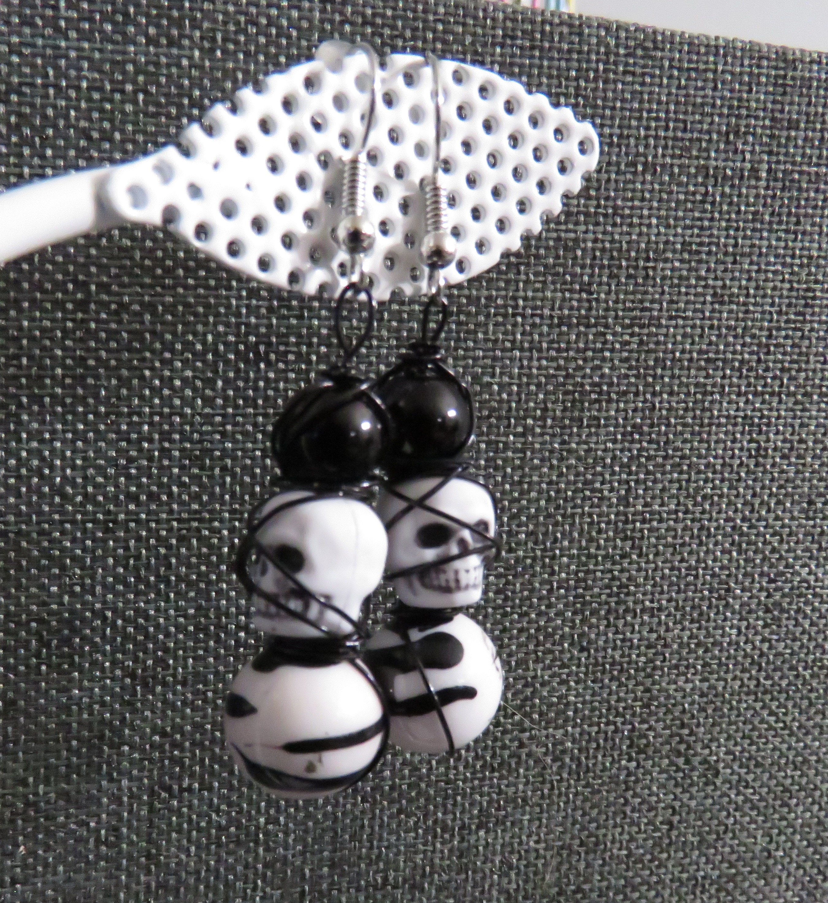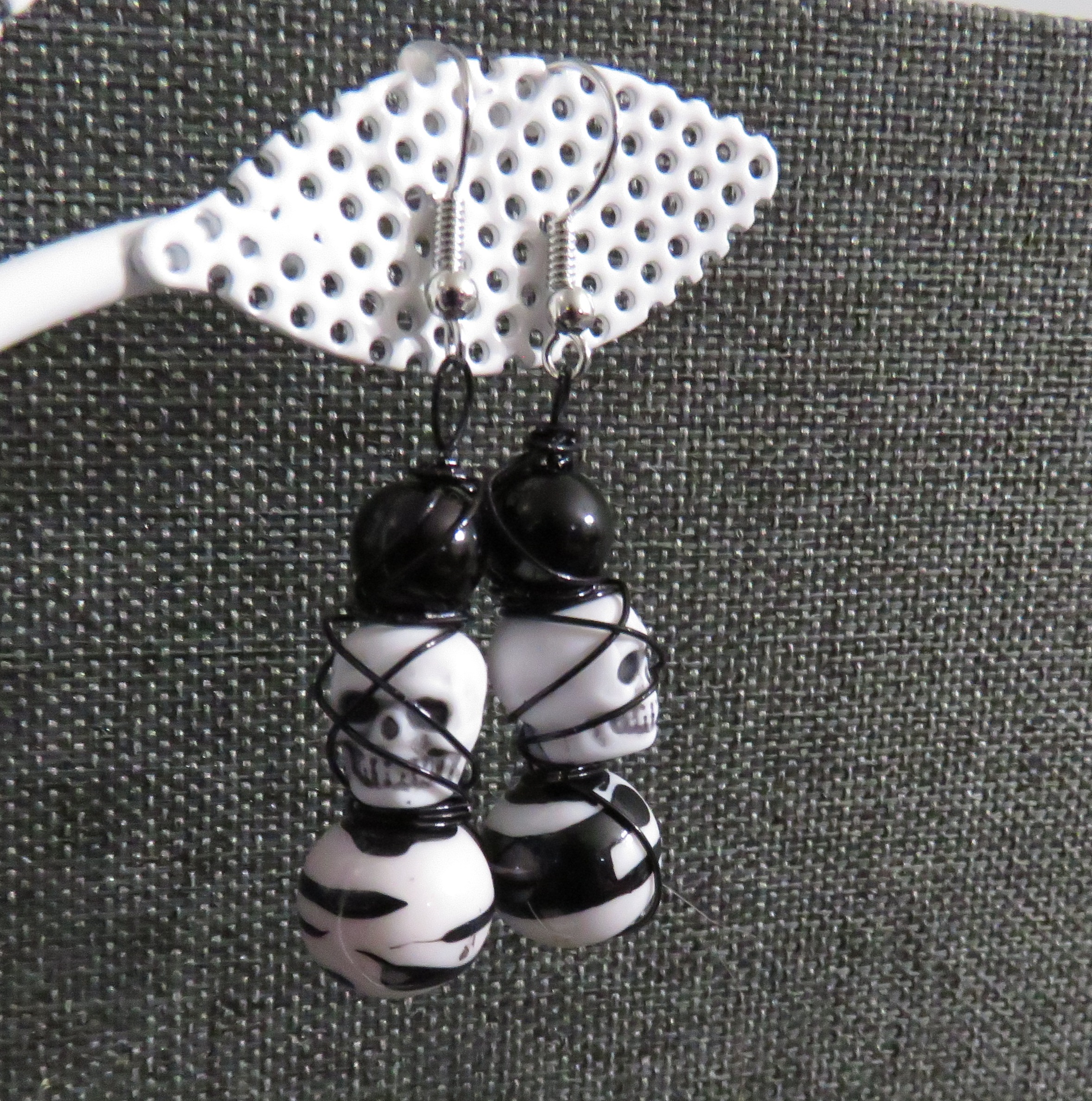 White and Black Swirled Skull Black Wire Wrapped Earrings