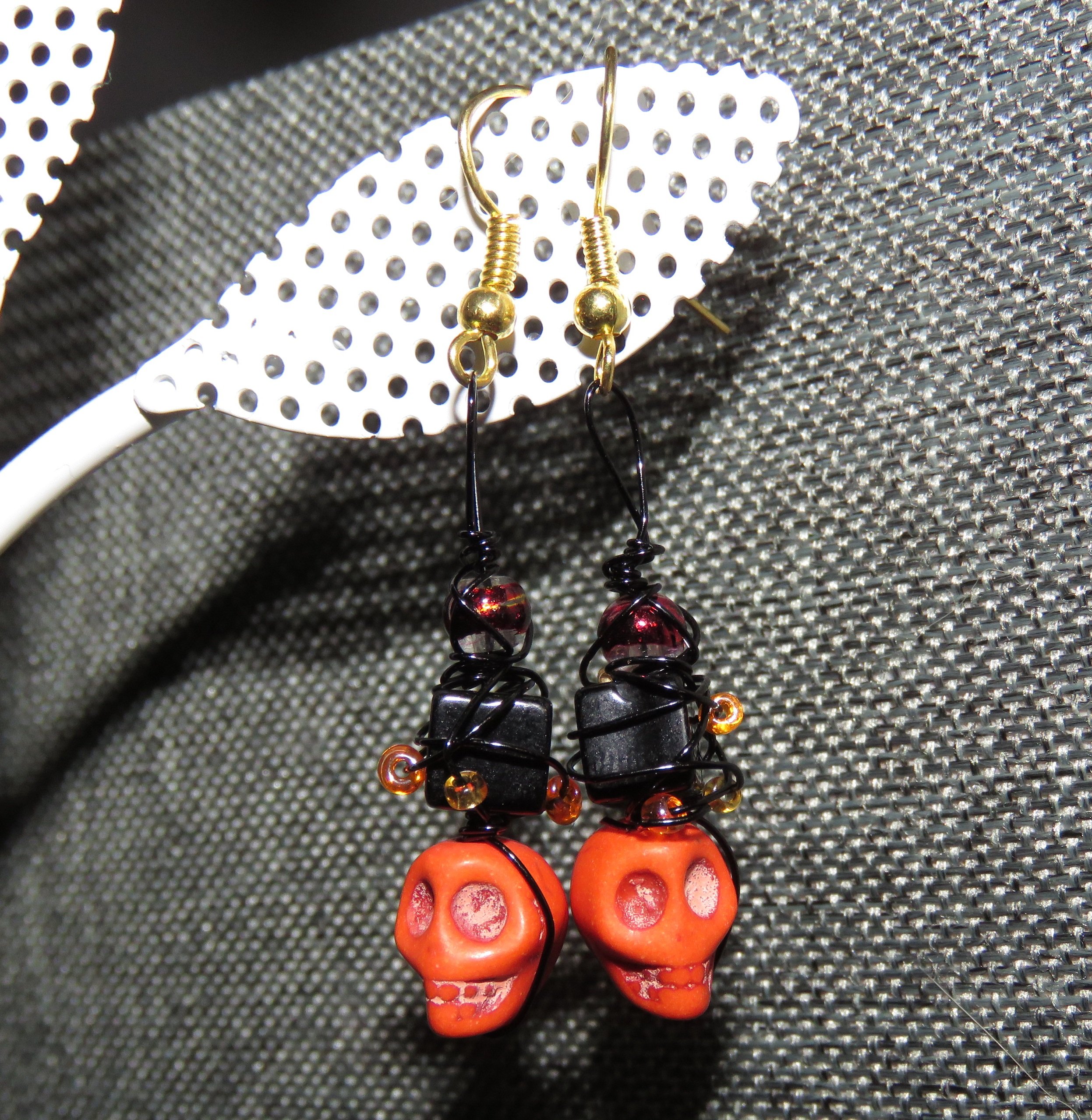 Orange Skull black wire wrapped red gold Earrings [Halloween 2022 Drop]