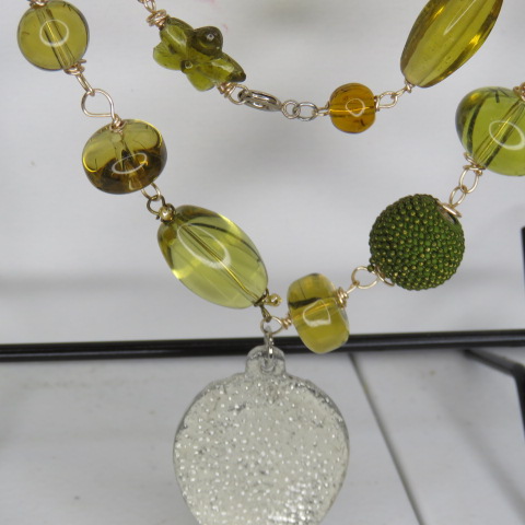 Leafy Large Pendant yellow-green Glass Hand Beaded Necklace