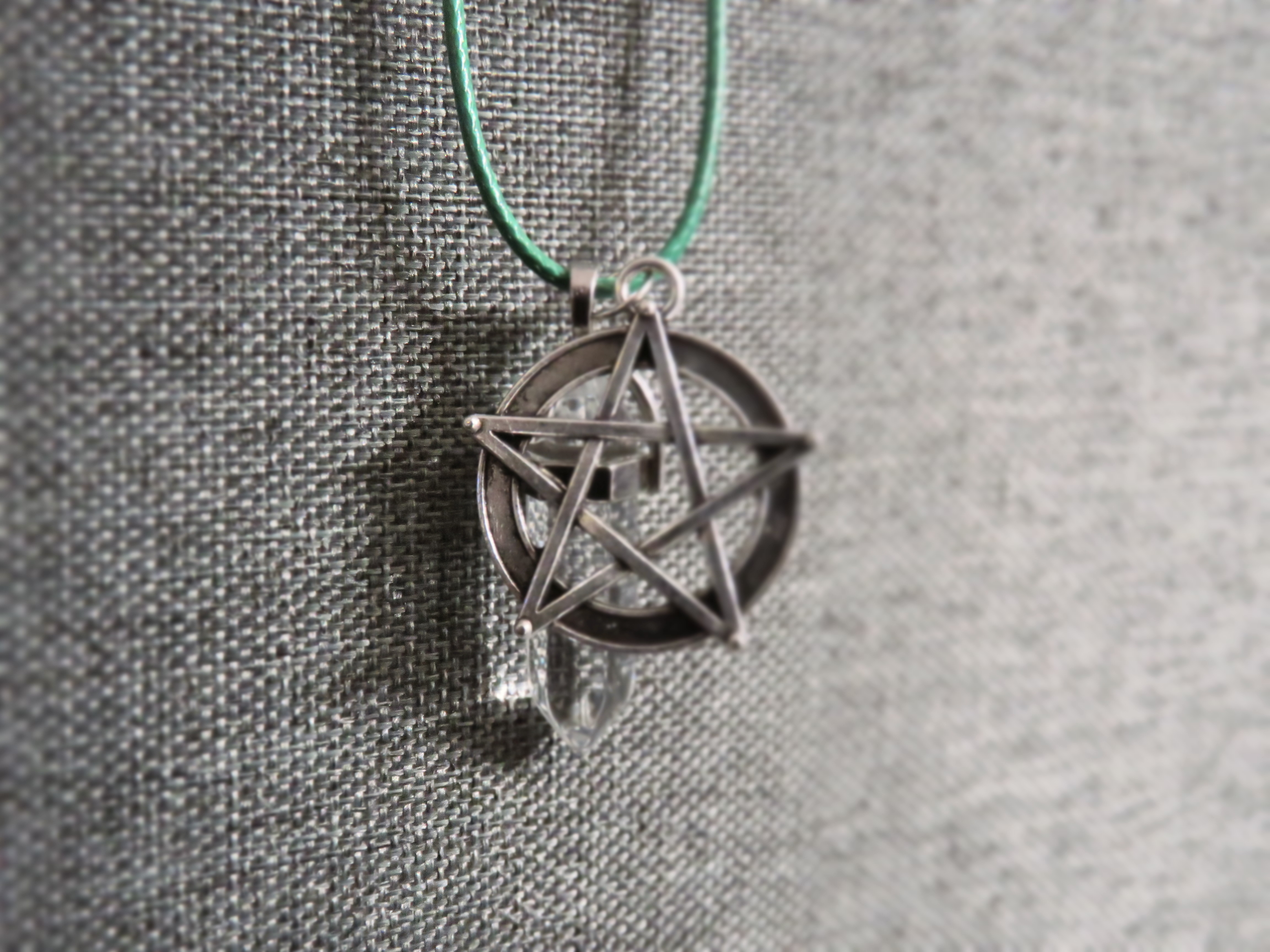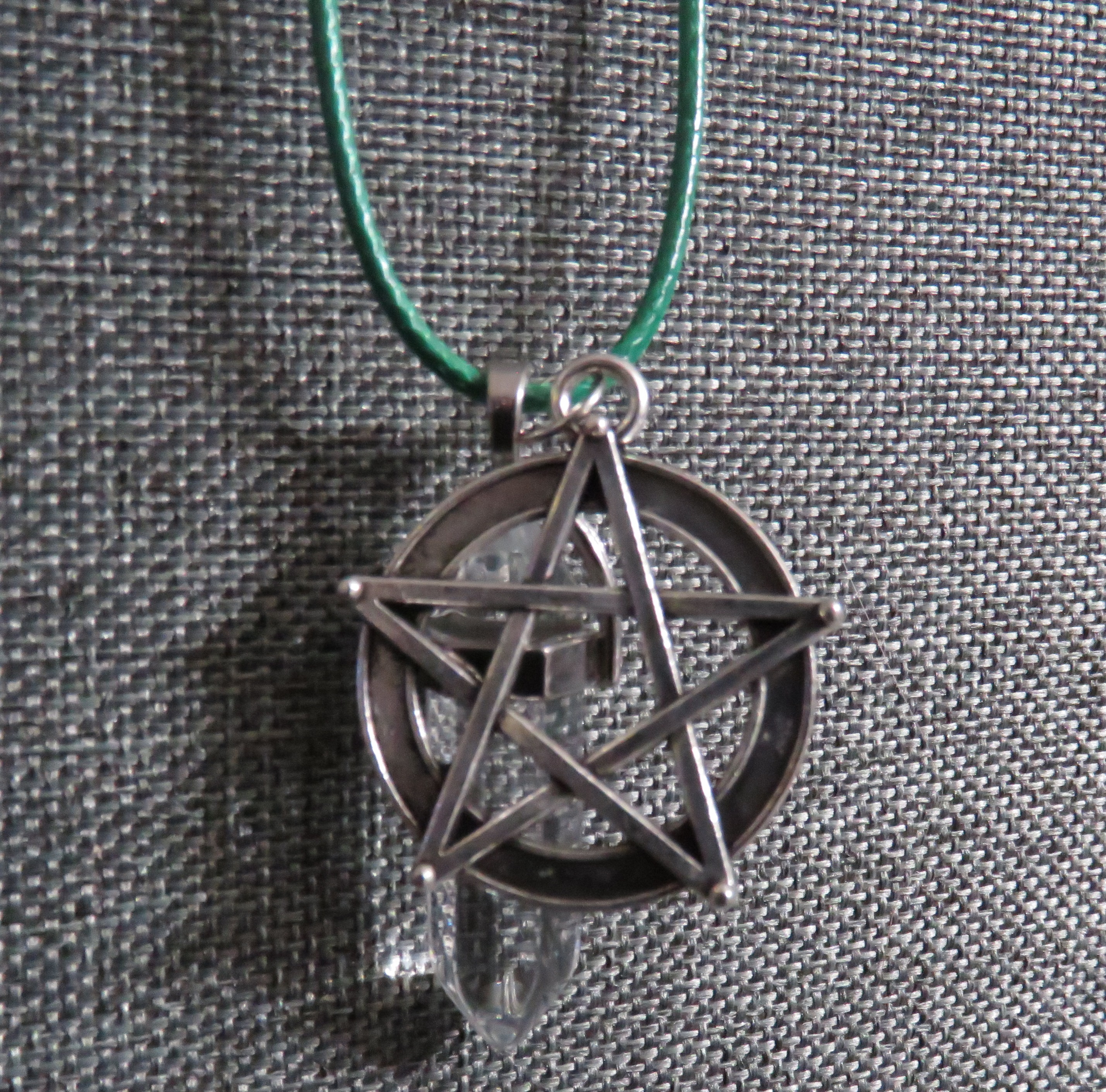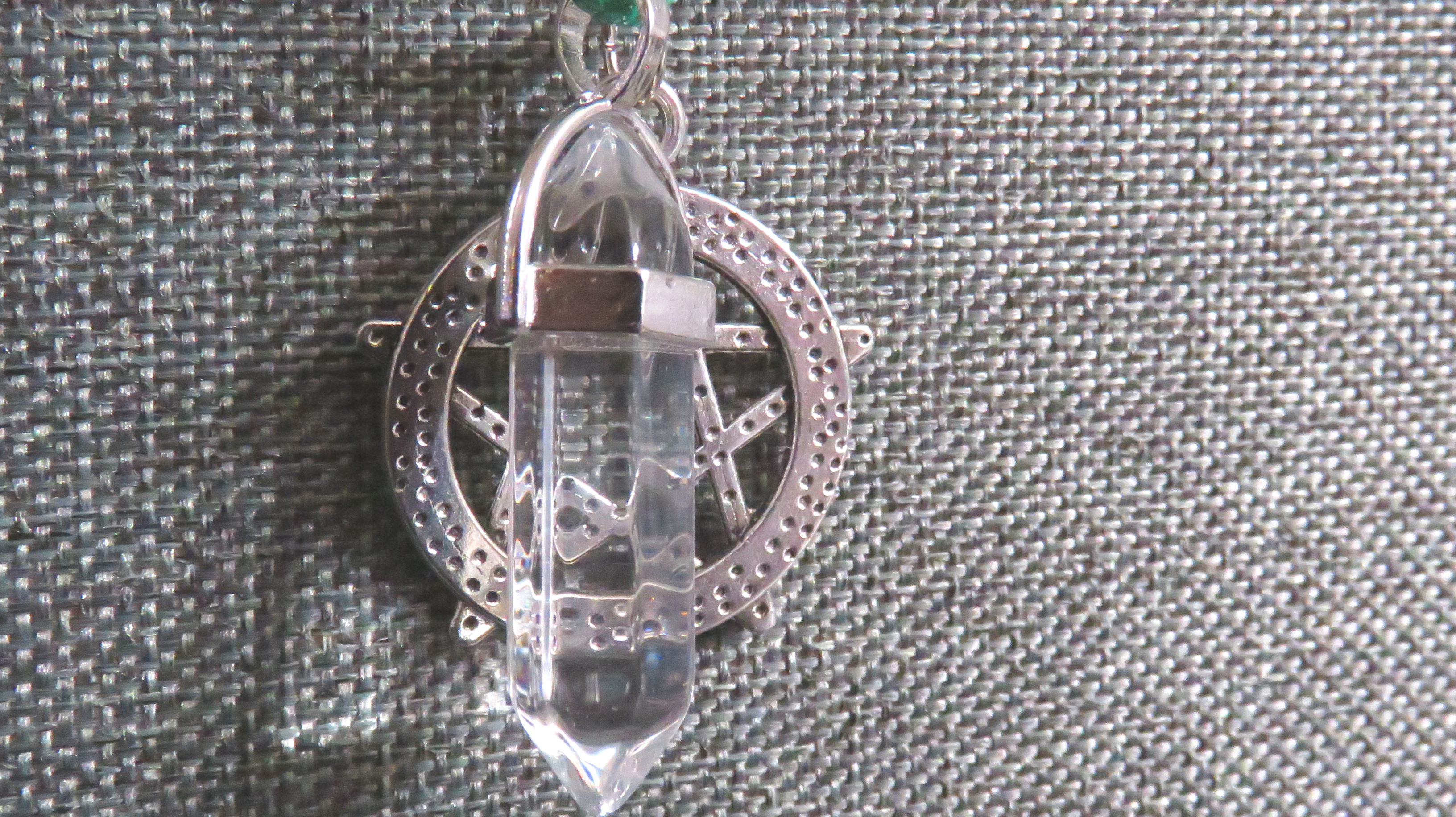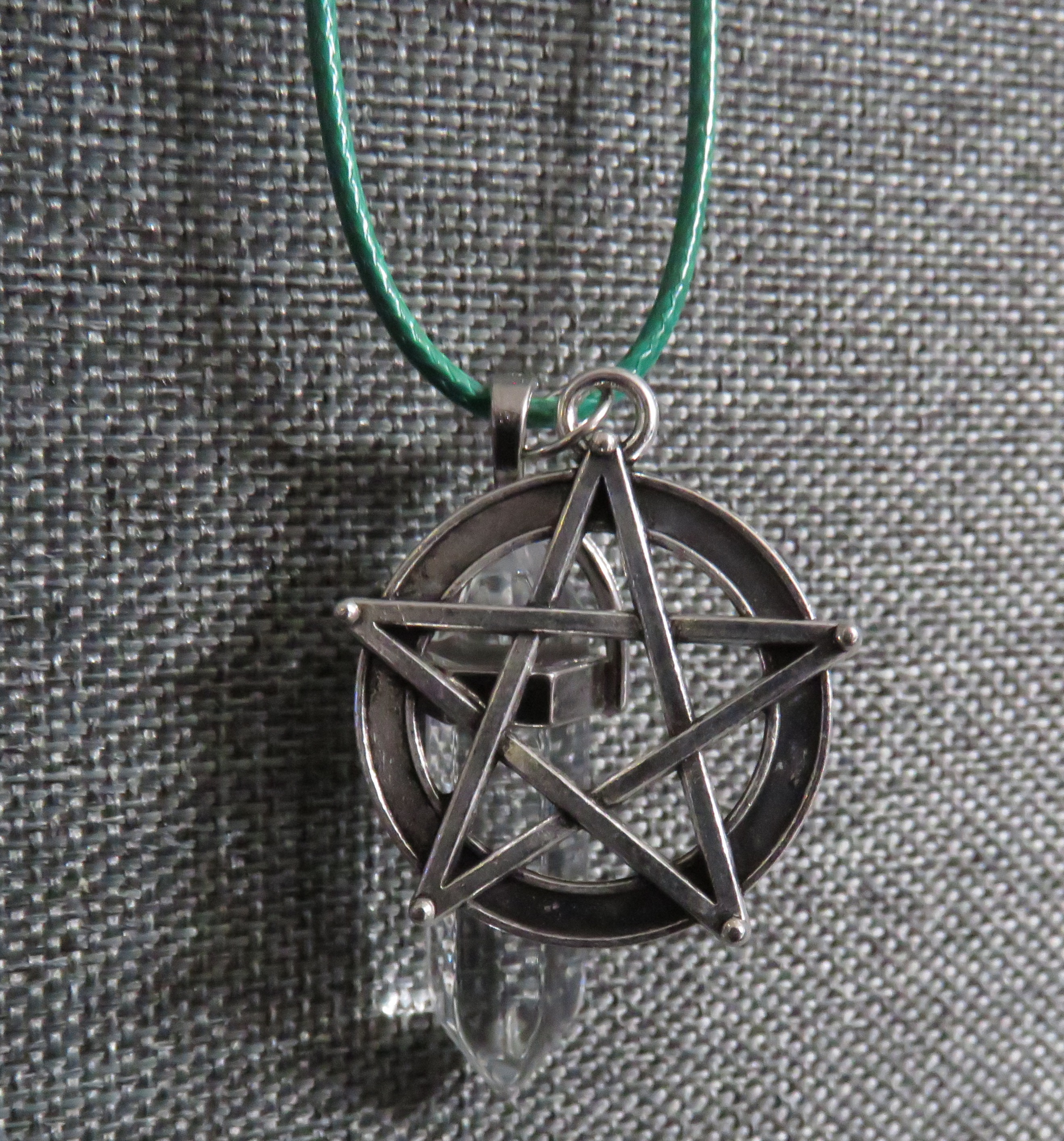 Large Silver Star Charm with Clear Glass Simulated Quartz Crystal Pendant, Green Cord Necklace