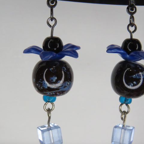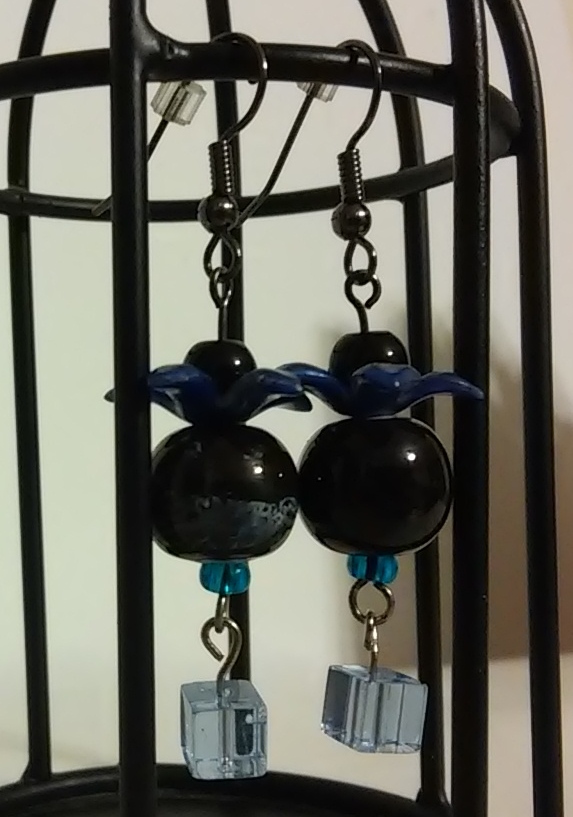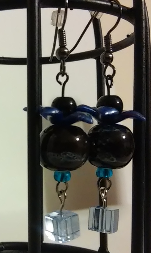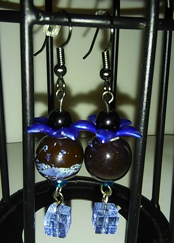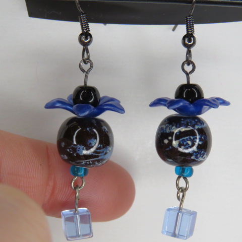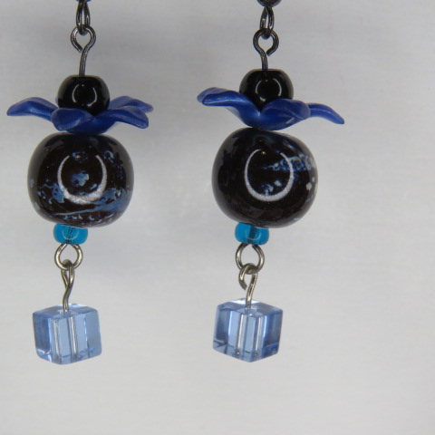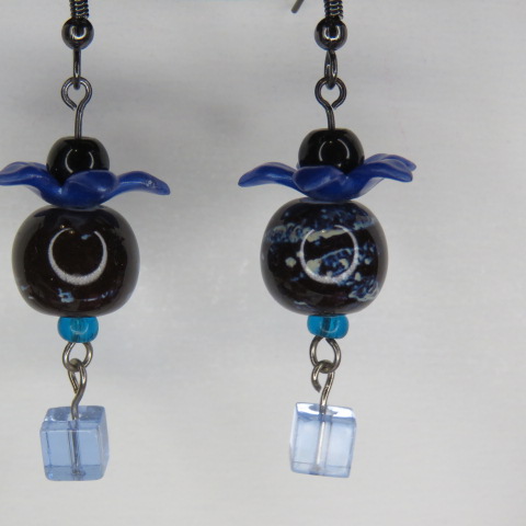 Blue Flower and Cube Dangle with Natural Stone Swirly Colored Bead Earrings