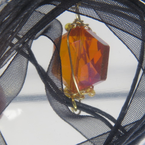 gold orange and black, gothic, vampire, edgy style fashion jewelry type feel. glass bead, black ribbon and twine cord
