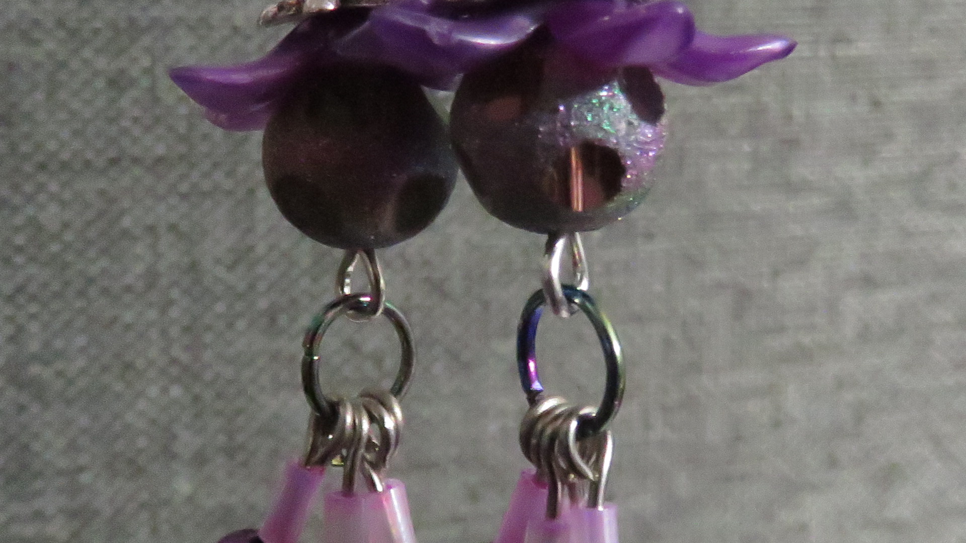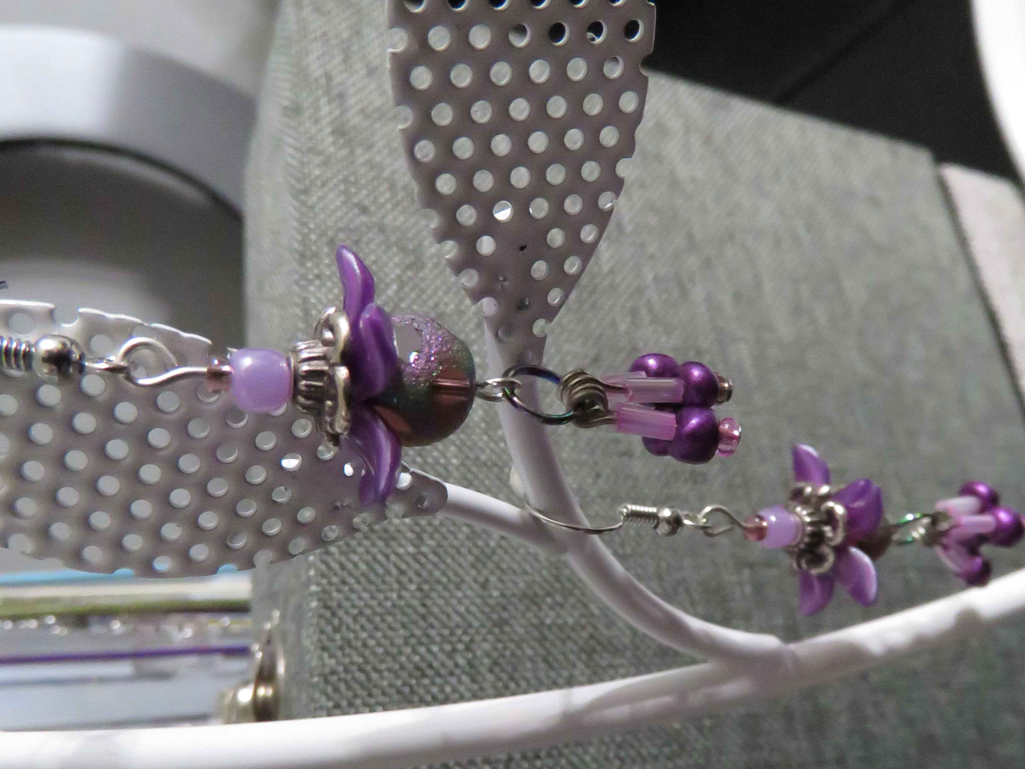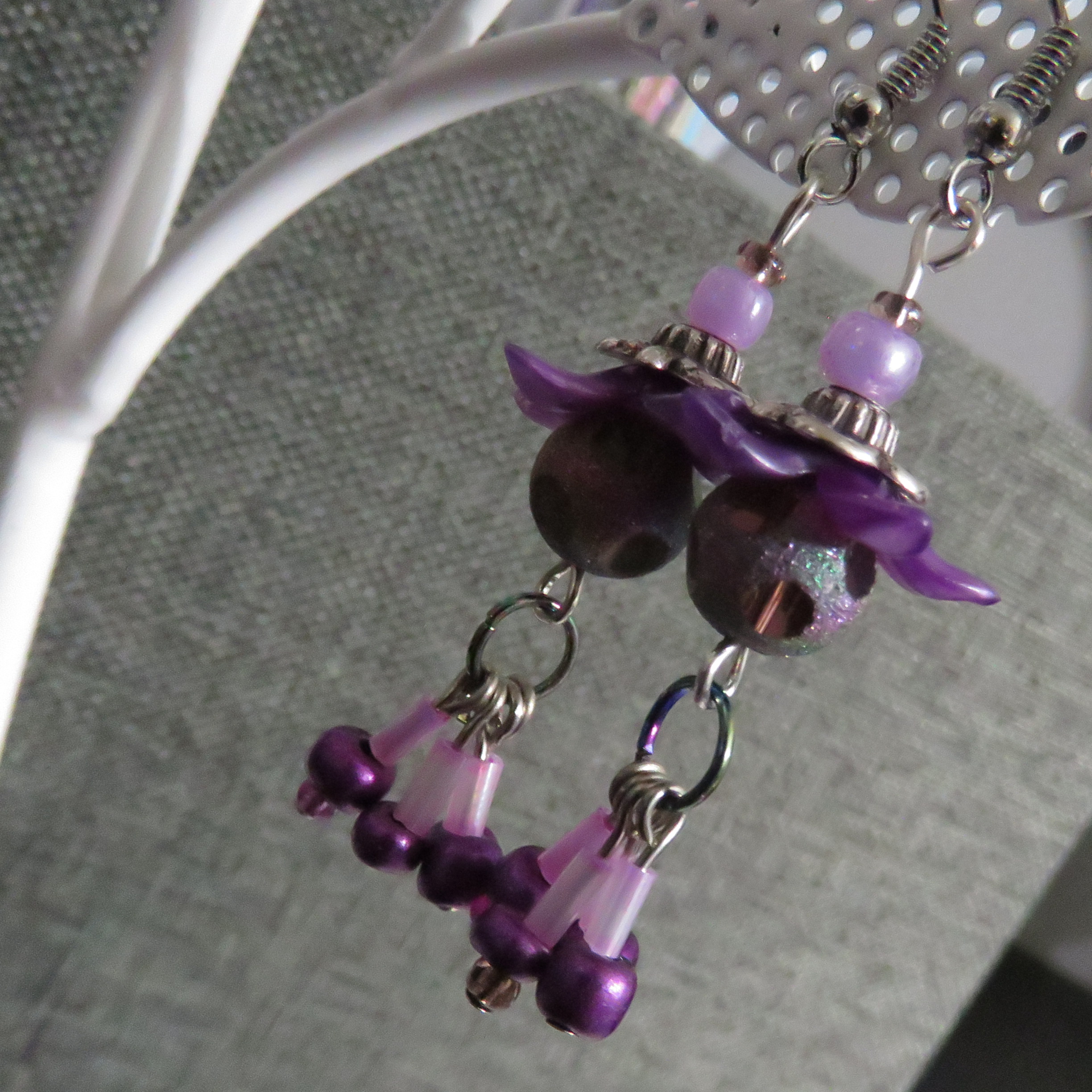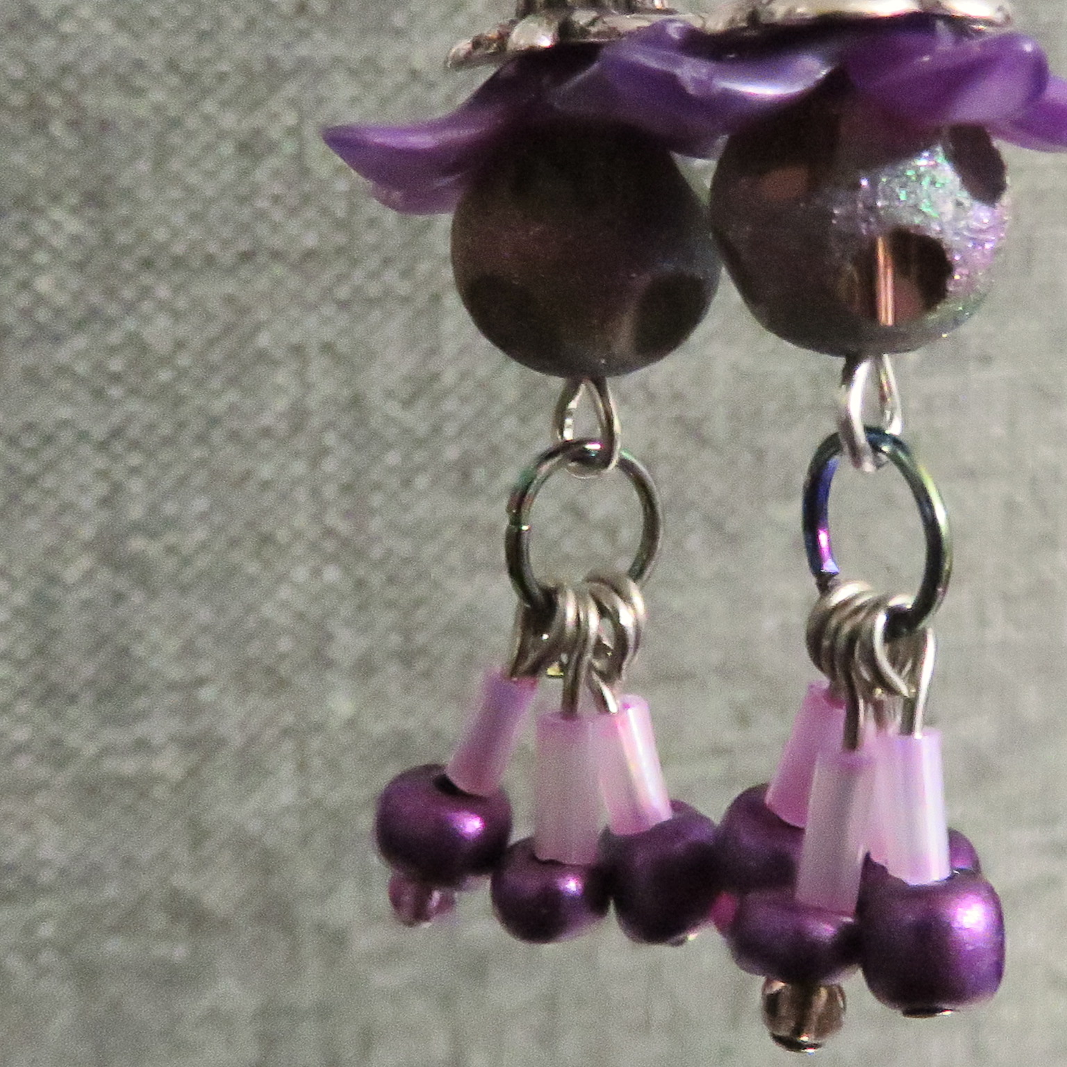 Purple and Lavender Flower Drop Center, Silver Earrings