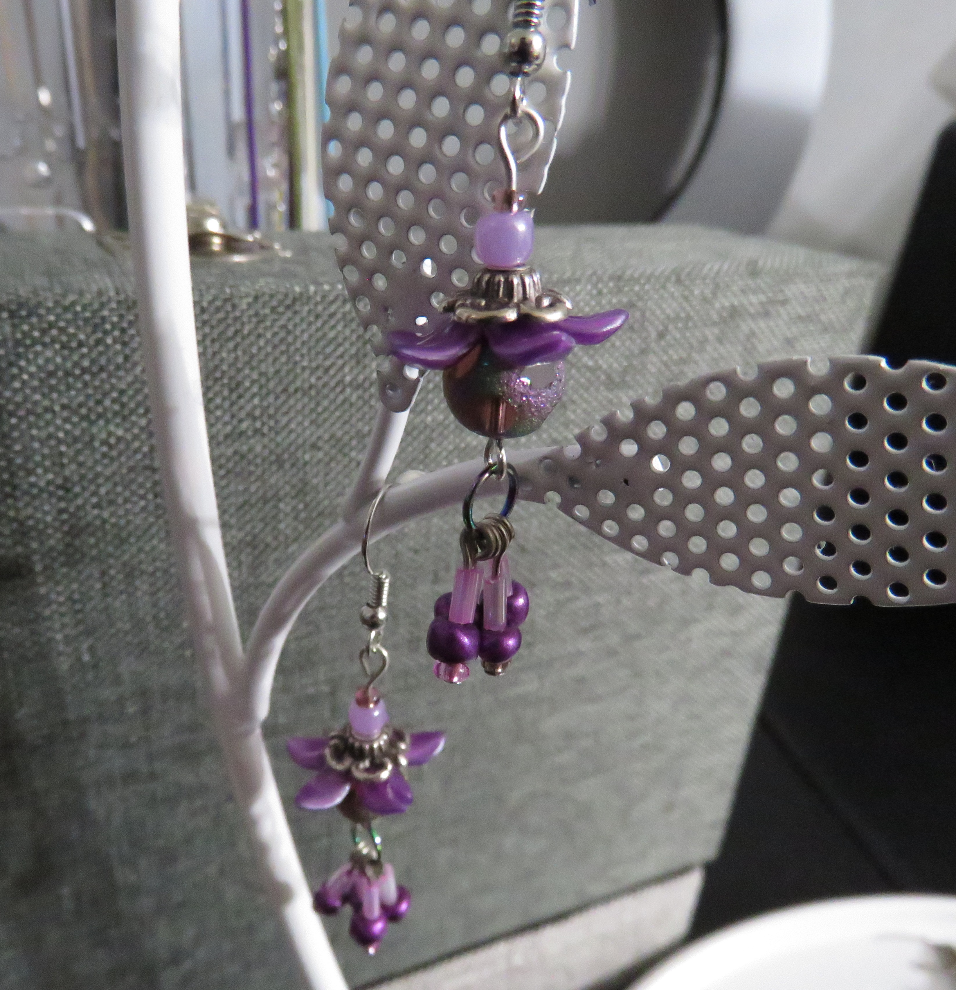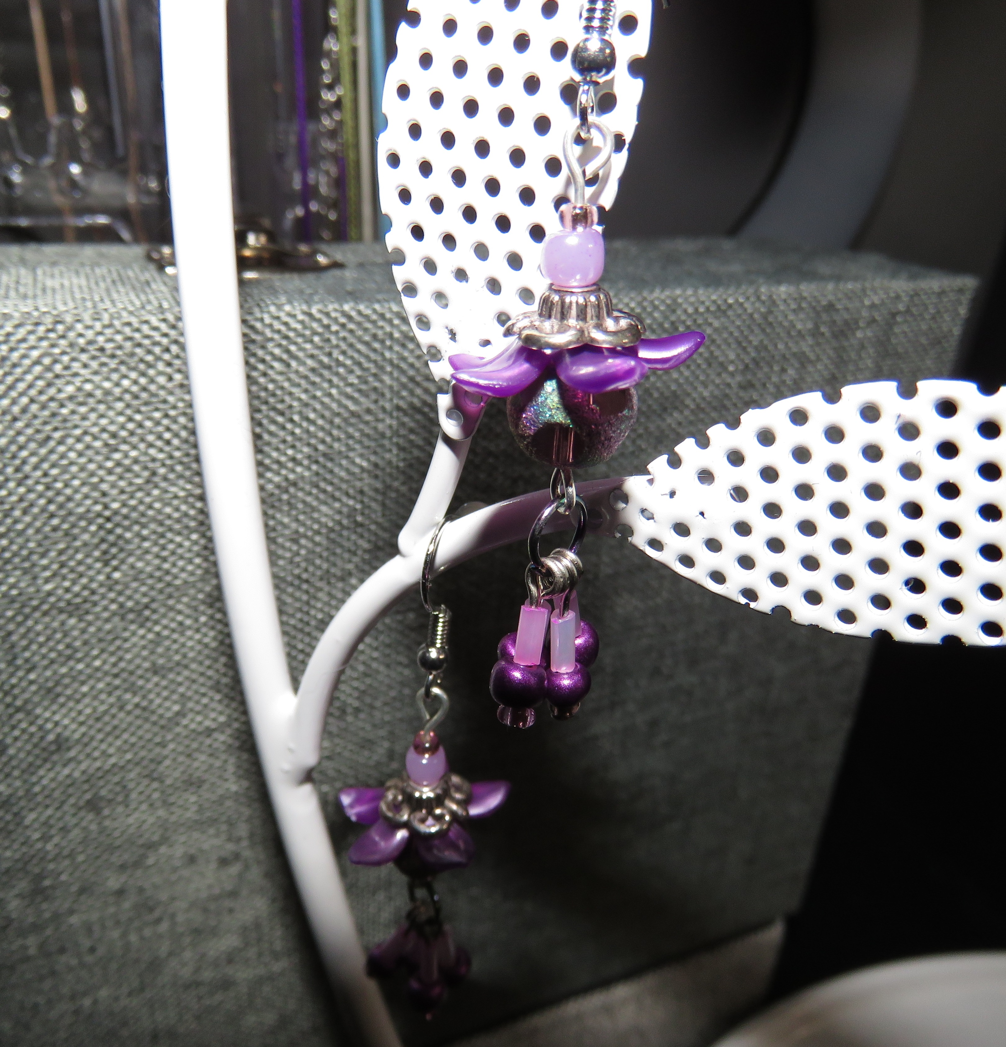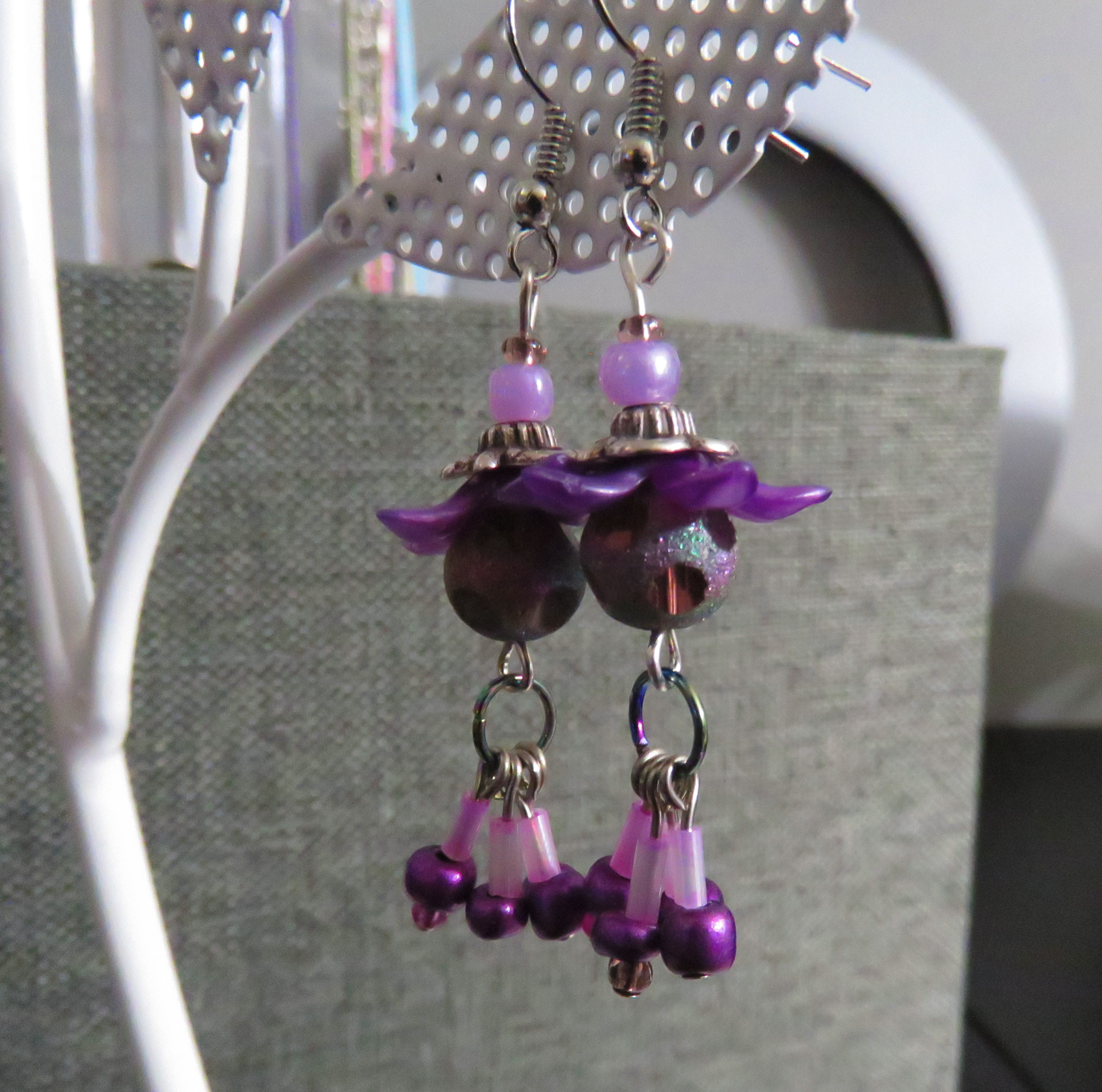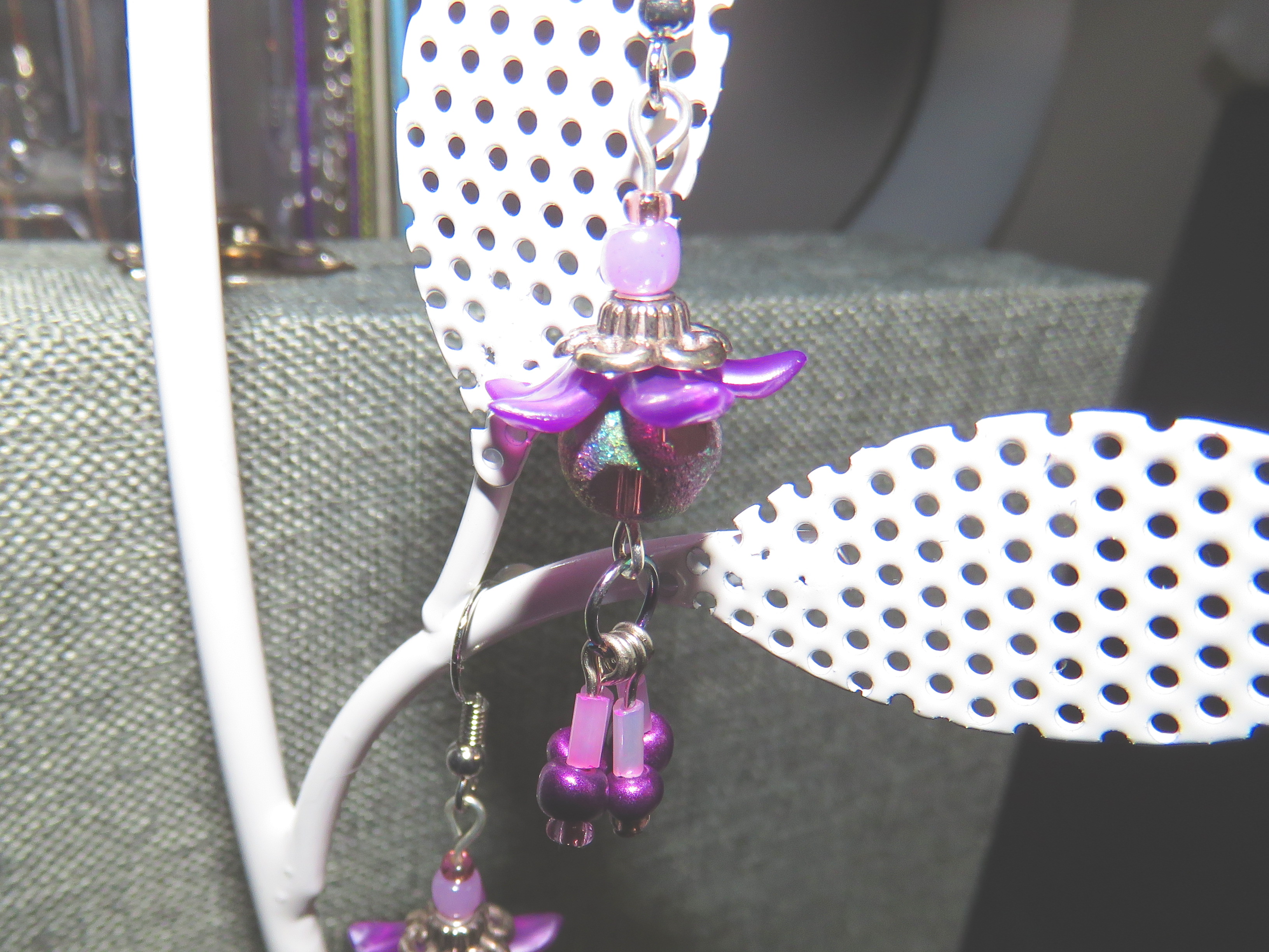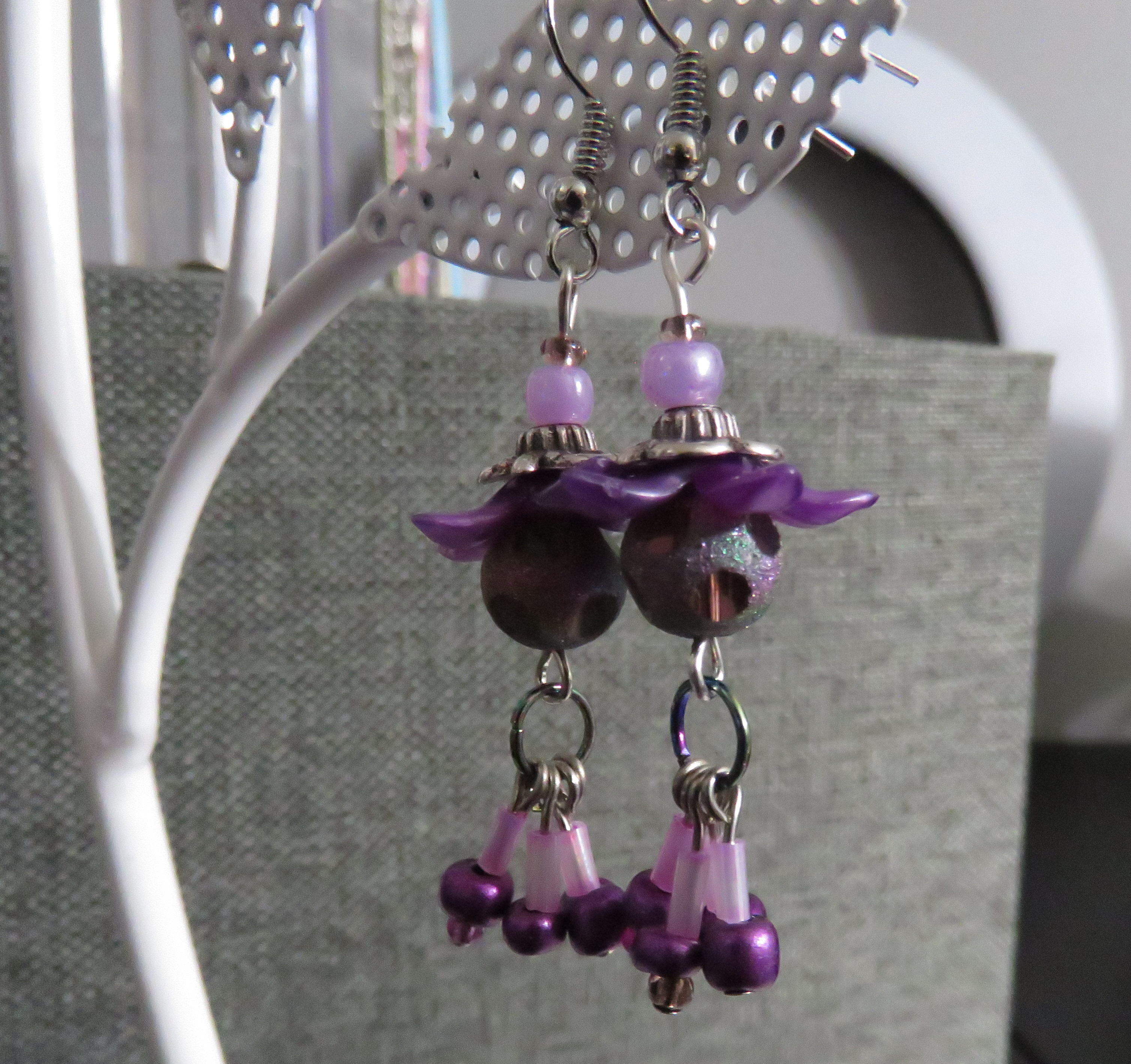 Purple and Lavender Flower Drop Center, Silver Earrings